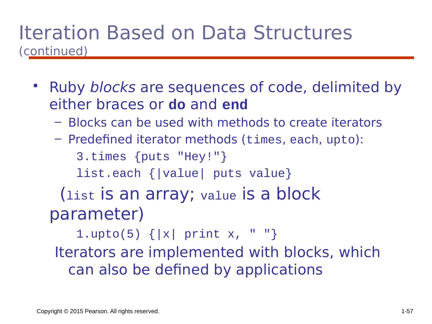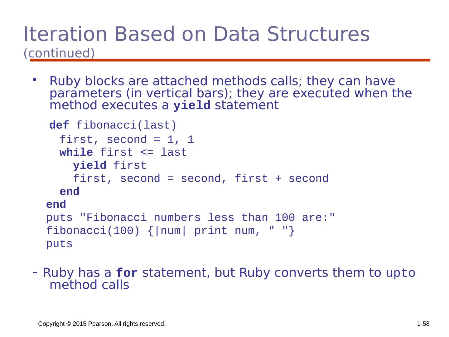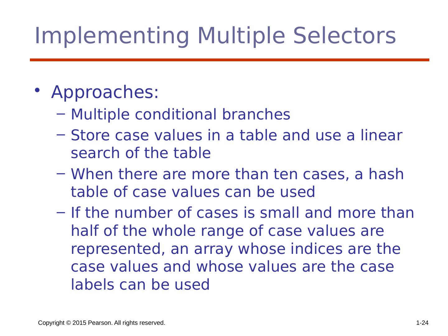 24 .Implementing Multiple Selectors Approaches: Multiple conditional branches Store case values in a table and use a linear search of the table When there are more than ten cases, a hash table of case values can be used If the number of cases is small and more than half of the whole range of case values are represented, an array whose indices are the case values and whose values are the case labels can be used Copyright © 2015 Pearson. All rights reserved. 1- 24
