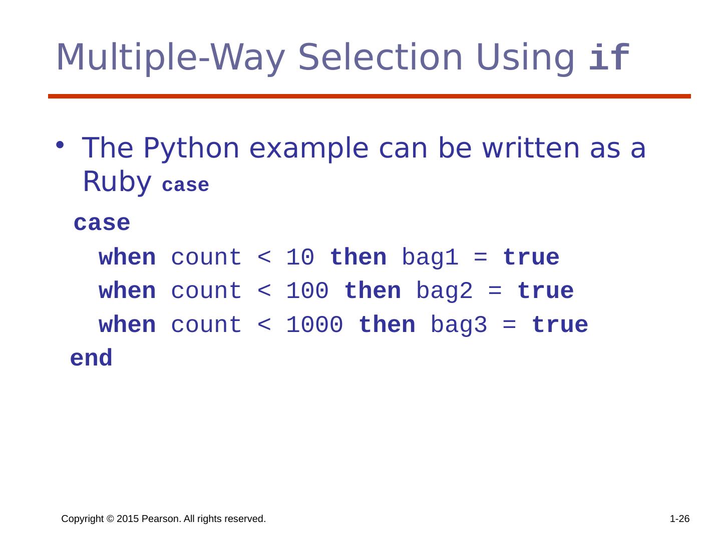 26 .Copyright © 2015 Pearson. All rights reserved. 1- 26 Multiple-Way Selection Using if The Python example can be written as a Ruby case case when count < 10 then bag1 = true when count < 100 then bag2 = true when count < 1000 then bag3 = true end