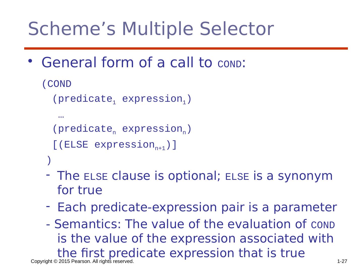 27 .Scheme’s Multiple Selector General form of a call to COND : (COND (predicate 1 expression 1 ) … (predicate n expression n ) [(ELSE expression n+1 )] ) The ELSE clause is optional; ELSE is a synonym for true Each predicate-expression pair is a parameter - Semantics: The value of the evaluation of COND is the value of the expression associated with the first predicate expression that is true Copyright © 2015 Pearson. All rights reserved. 1- 27