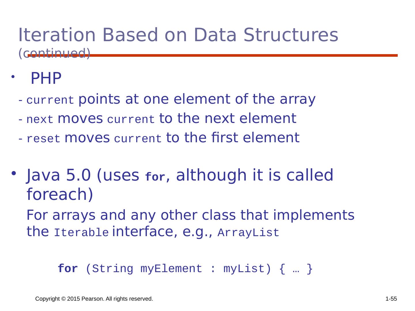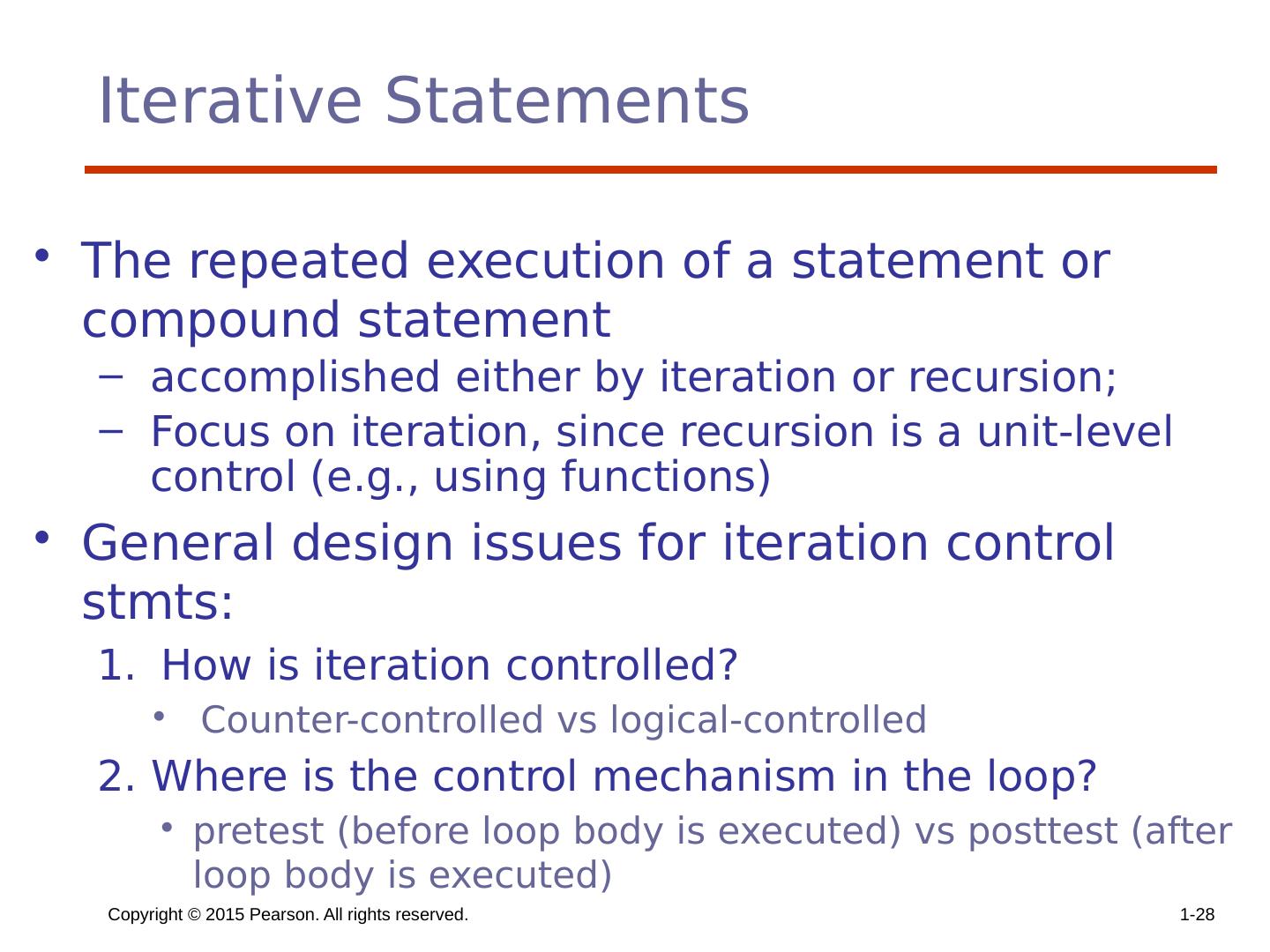 28 .Copyright © 2015 Pearson. All rights reserved. 1- 28 Iterative Statements The repeated execution of a statement or compound statement accomplished either by iteration or recursion; Focus on iteration, since recursion is a unit-level control (e.g., using functions) General design issues for iteration control stmts : How is iteration controlled? Counter-controlled vs logical-controlled 2. Where is the control mechanism in the loop? pretest (before loop body is executed) vs posttest (after loop body is executed)
