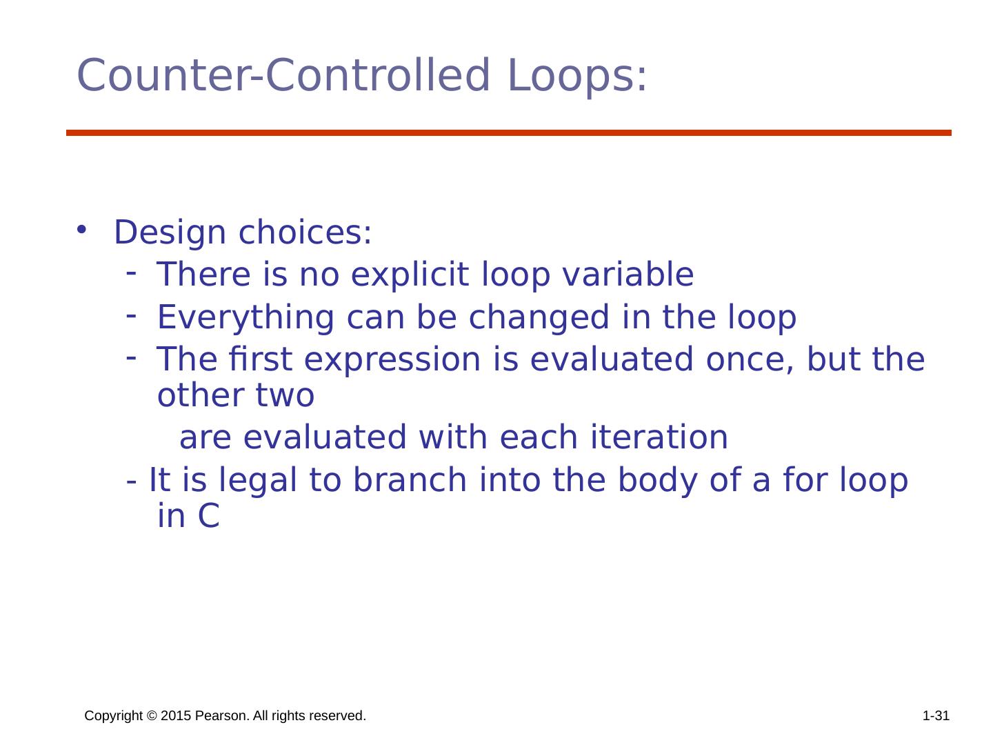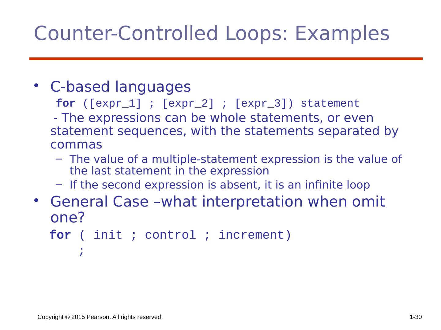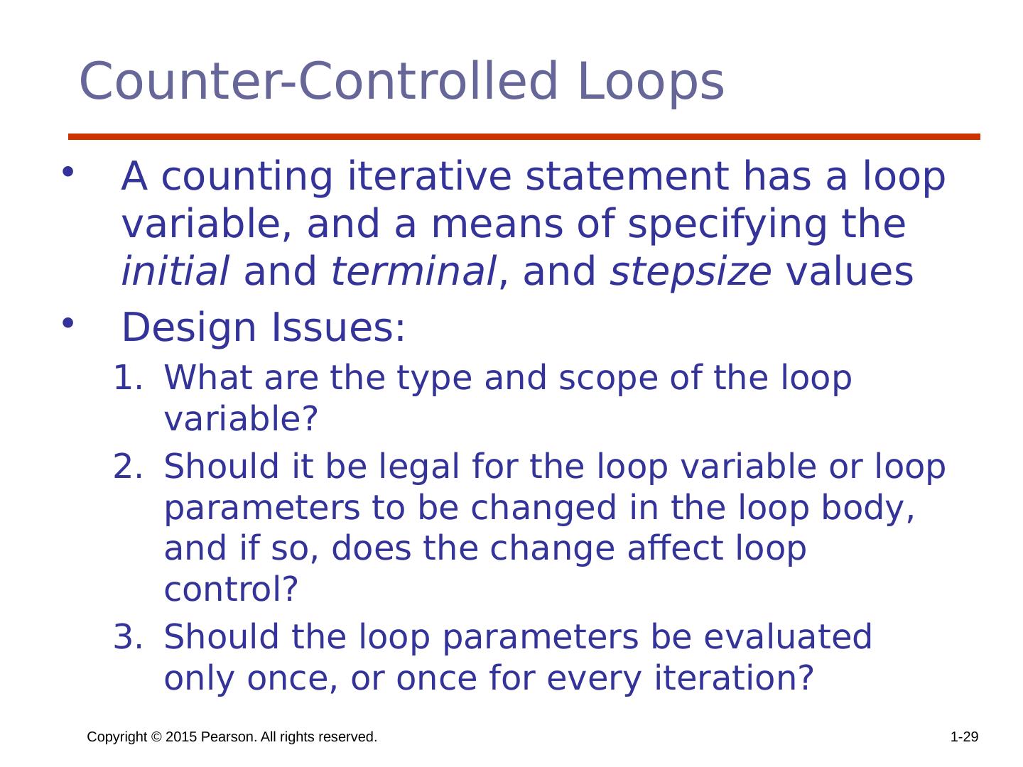 29 .Copyright © 2015 Pearson. All rights reserved. 1- 29 Counter-Controlled Loops A counting iterative statement has a loop variable, and a means of specifying the initial and terminal , and stepsize values Design Issues: What are the type and scope of the loop variable? Should it be legal for the loop variable or loop parameters to be changed in the loop body, and if so, does the change affect loop control? Should the loop parameters be evaluated only once, or once for every iteration?