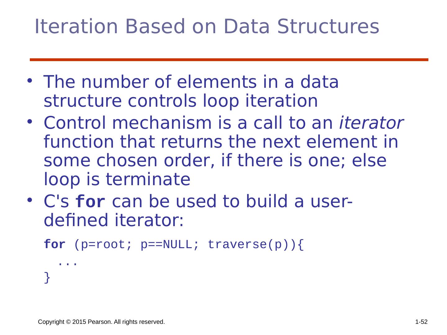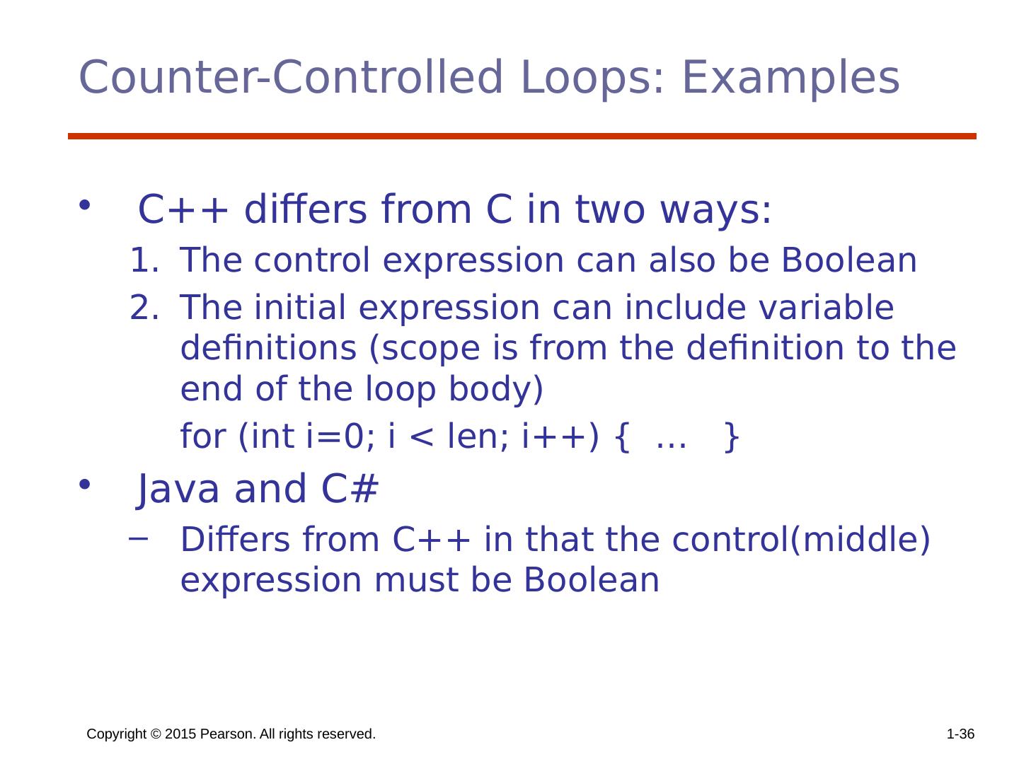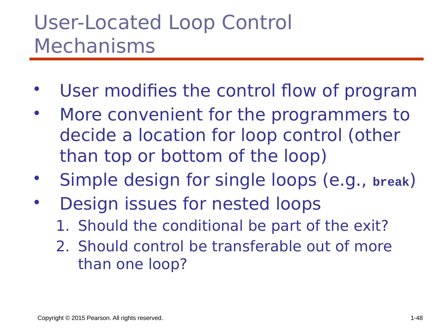 29 .Copyright © 2015 Pearson. All rights reserved. 1- 29 Counter-Controlled Loops A counting iterative statement has a loop variable, and a means of specifying the initial and terminal , and stepsize values Design Issues: What are the type and scope of the loop variable? Should it be legal for the loop variable or loop parameters to be changed in the loop body, and if so, does the change affect loop control? Should the loop parameters be evaluated only once, or once for every iteration?