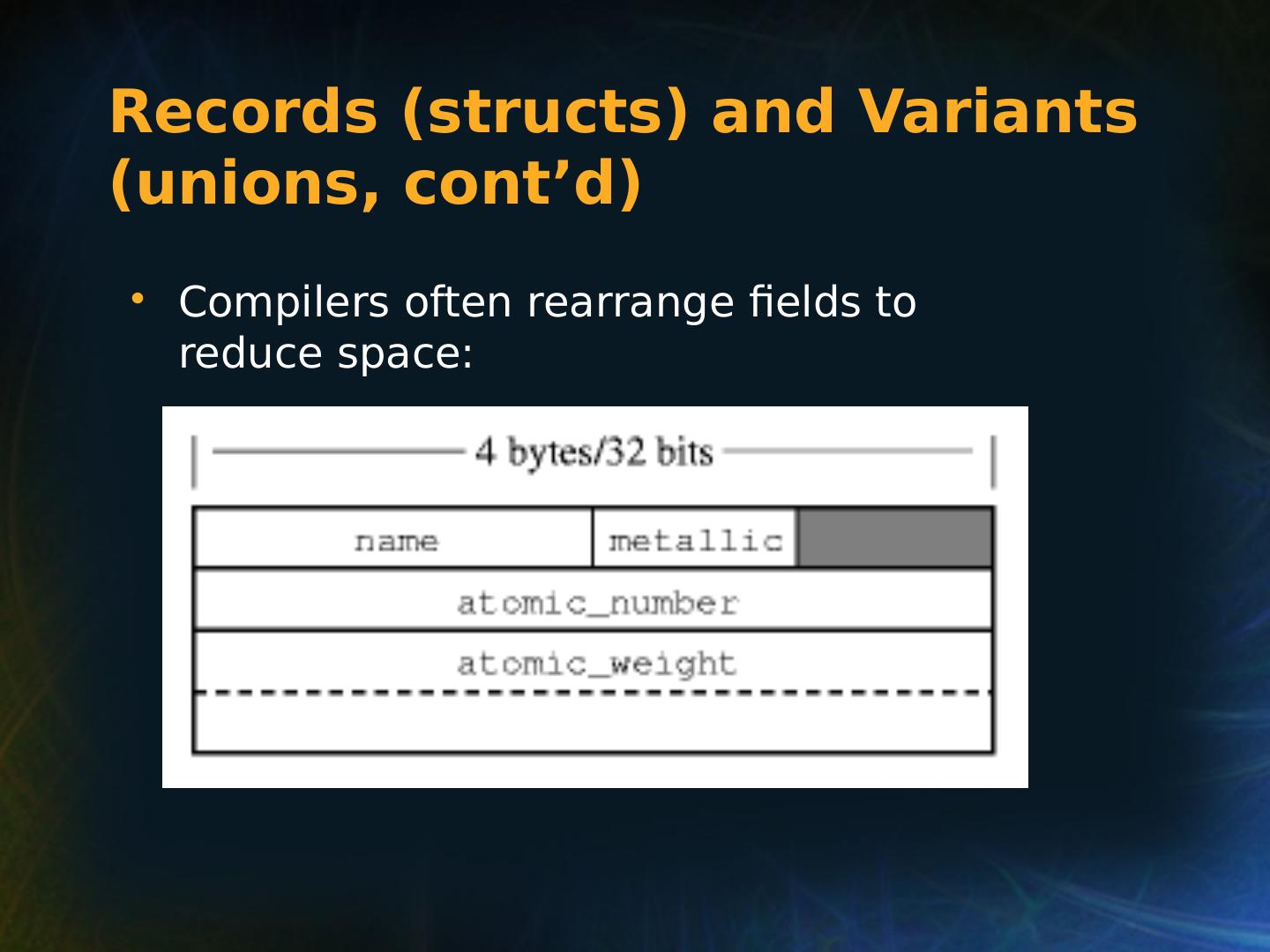 7 .Type compatability/equivalence Compatability: tells you what you can do More useful concept of the two Erroneously used interchangeably Equivalence: What are important differences between type declarations? Format does not matter: struct { int a, b; } Same as struct { struct{ int a, b; AND int a; } int b;}
