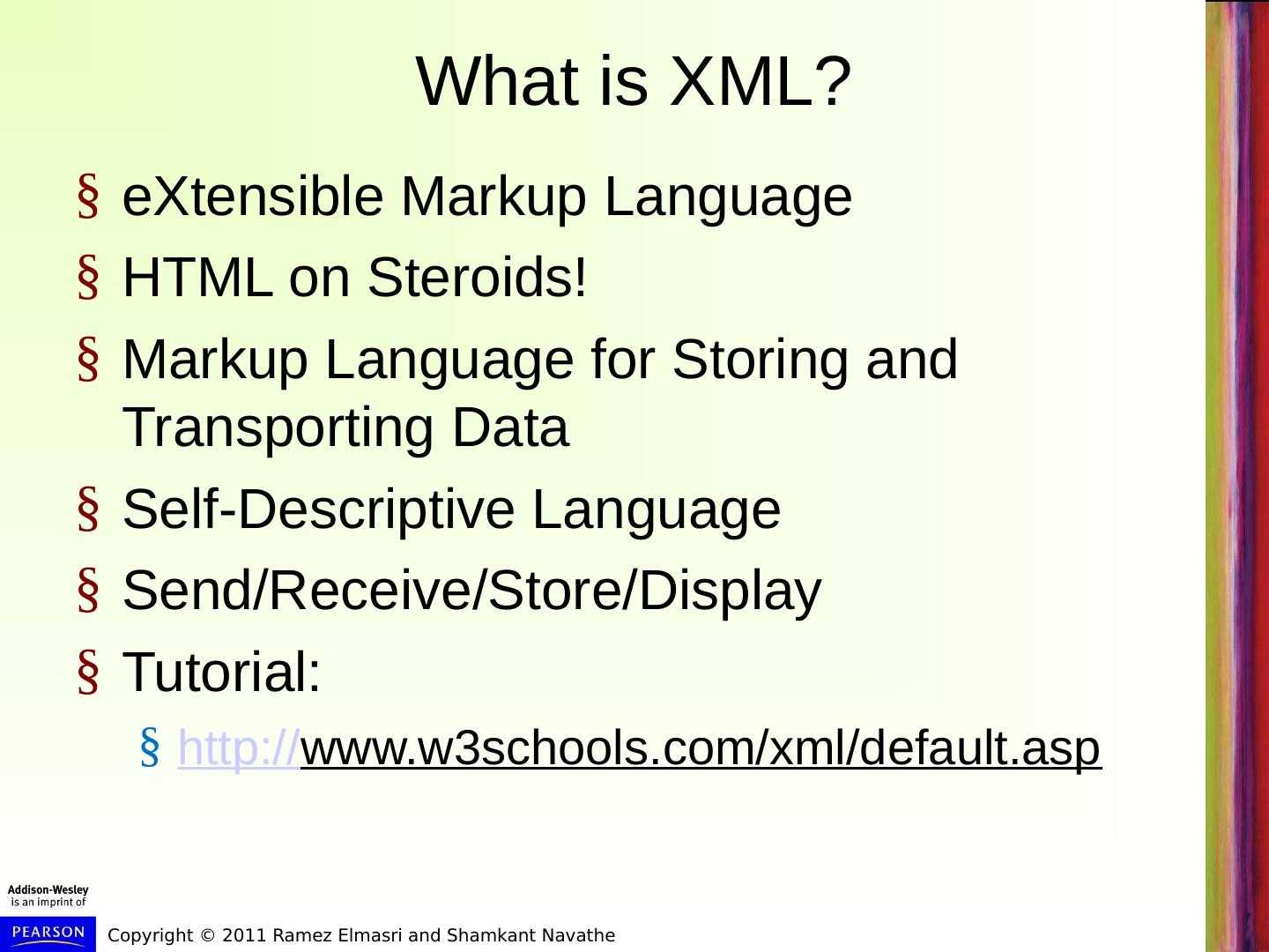 3 .What is XML? eXtensible Markup Language HTML on Steroids! Markup Language for Storing and Transporting Data Self-Descriptive Language Send/Receive/Store/Display Tutorial: http:// www.w3schools.com/xml/default.asp