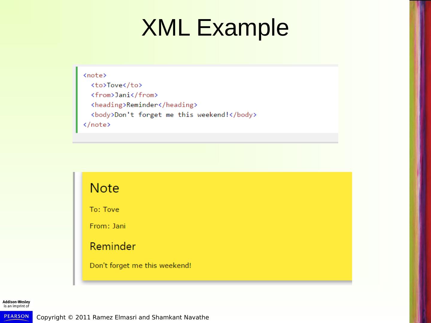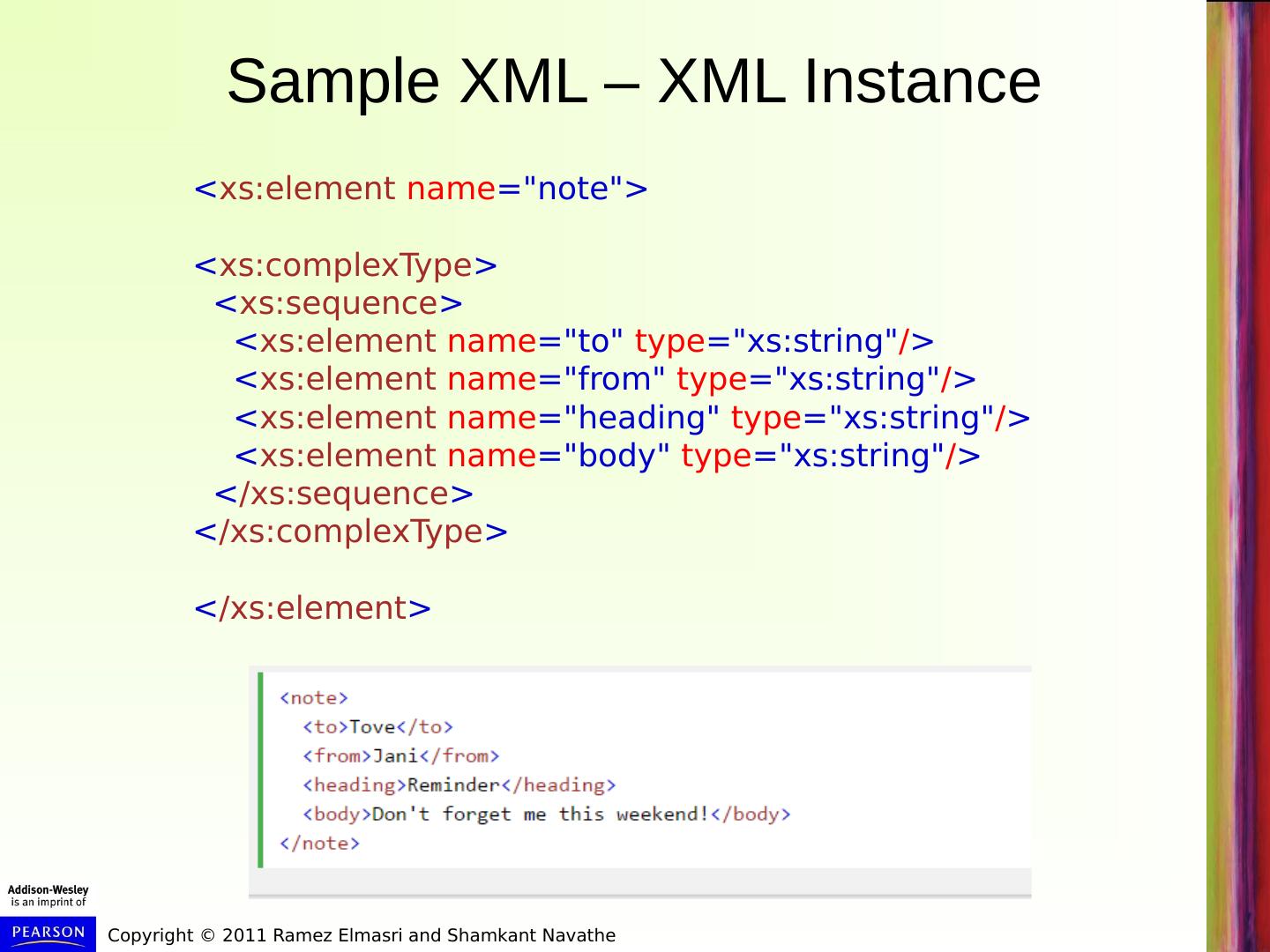 10 .Sample XML – XML Instance < xs:element name ="note"> < xs:complexType > < xs:sequence > < xs:element name ="to" type =" xs:string " / > < xs:element name ="from" type =" xs:string " / > < xs:element name ="heading" type =" xs:string " / > < xs:element name ="body" type =" xs:string " / > < / xs:sequence > < / xs:complexType > < / xs:element >