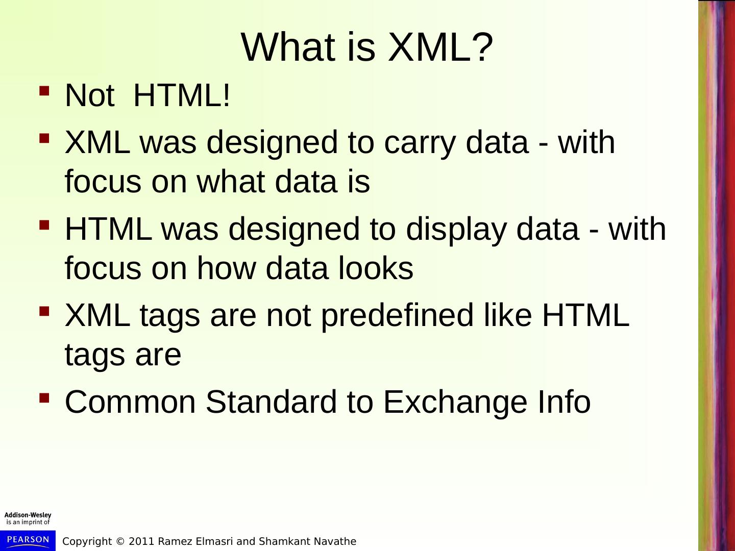 5 .What is XML? Not HTML! XML was designed to carry data - with focus on what data is HTML was designed to display data - with focus on how data looks XML tags are not predefined like HTML tags are Common Standard to Exchange Info