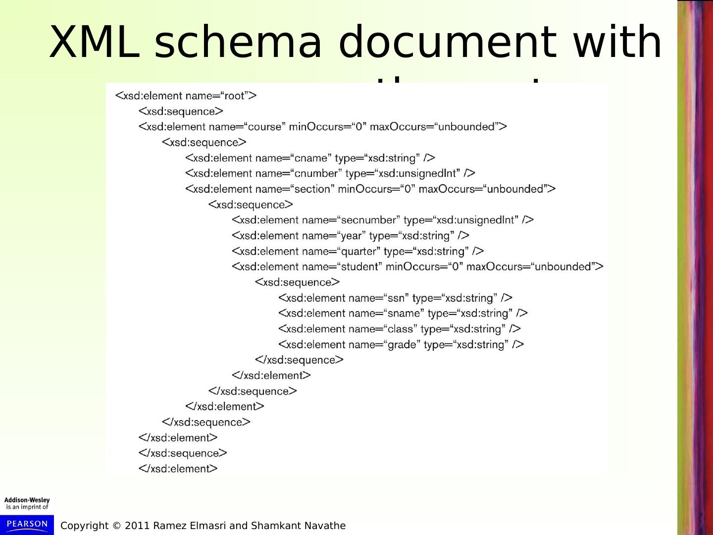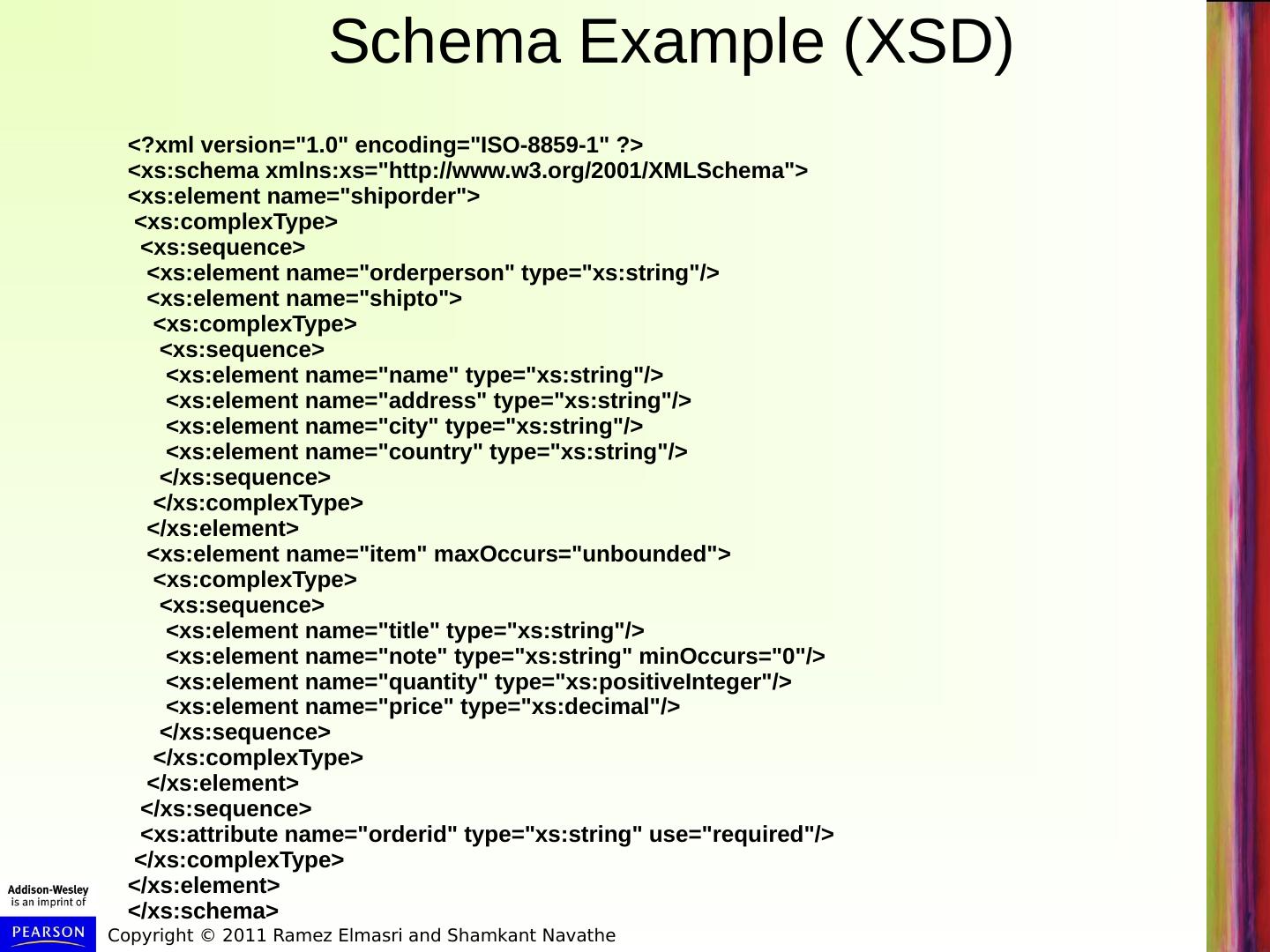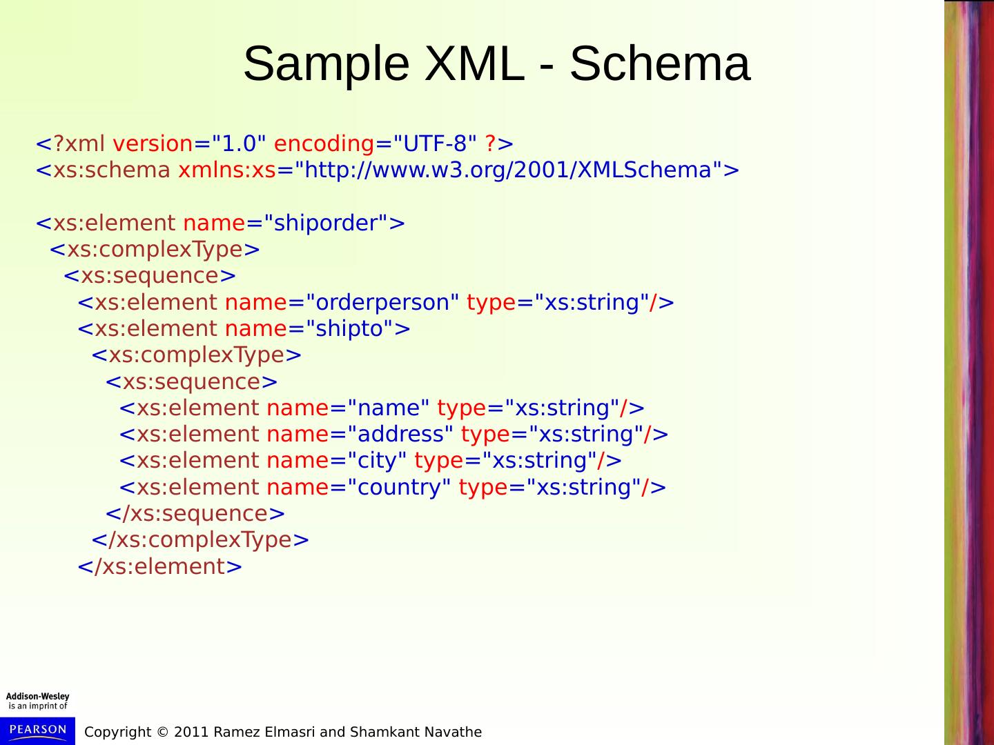 11 .Sample XML - Schema < ?xml version ="1.0" encoding ="UTF-8" ? > < xs:schema xmlns:xs ="http://www.w3.org/2001/XMLSchema"> < xs:element name =" shiporder "> < xs:complexType > < xs:sequence > < xs:element name =" orderperson " type =" xs:string " / > < xs:element name =" shipto "> < xs:complexType > < xs:sequence > < xs:element name ="name" type =" xs:string " / > < xs:element name ="address" type =" xs:string " / > < xs:element name ="city" type =" xs:string " / > < xs:element name ="country" type =" xs:string " / > < / xs:sequence > < / xs:complexType > < / xs:element >