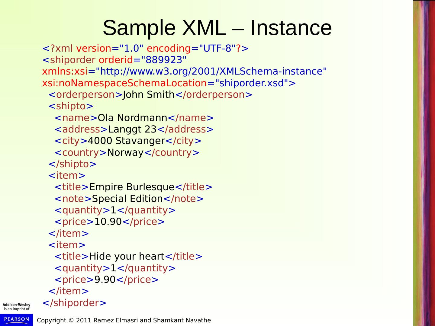 13 .Sample XML – Instance < ?xml version ="1.0" encoding ="UTF-8" ? > < shiporder orderid ="889923" xmlns:xsi ="http://www.w3.org/2001/XMLSchema-instance" xsi:noNamespaceSchemaLocation ="shiporder.xsd"> < orderperson > John Smith < / orderperson > < shipto > < name > Ola Nordmann < /name > < address > Langgt 23 < /address > < city > 4000 Stavanger < /city > < country > Norway < /country > < / shipto > < item > < title > Empire Burlesque < /title > < note > Special Edition < /note > < quantity > 1 < /quantity > < price > 10.90 < /price > < /item > < item > < title > Hide your heart < /title > < quantity > 1 < /quantity > < price > 9.90 < /price > < /item > < / shiporder >