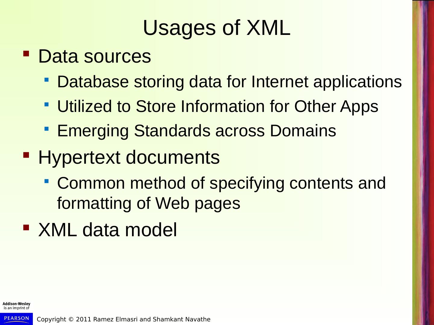 15 .Usages of XML Data sources Database storing data for Internet applications Utilized to Store Information for Other Apps Emerging Standards across Domains Hypertext documents Common method of specifying contents and formatting of Web pages XML data model