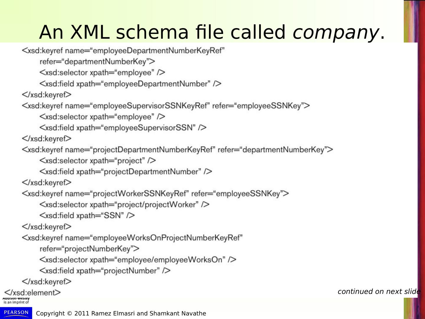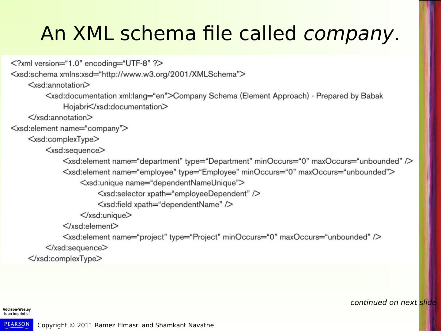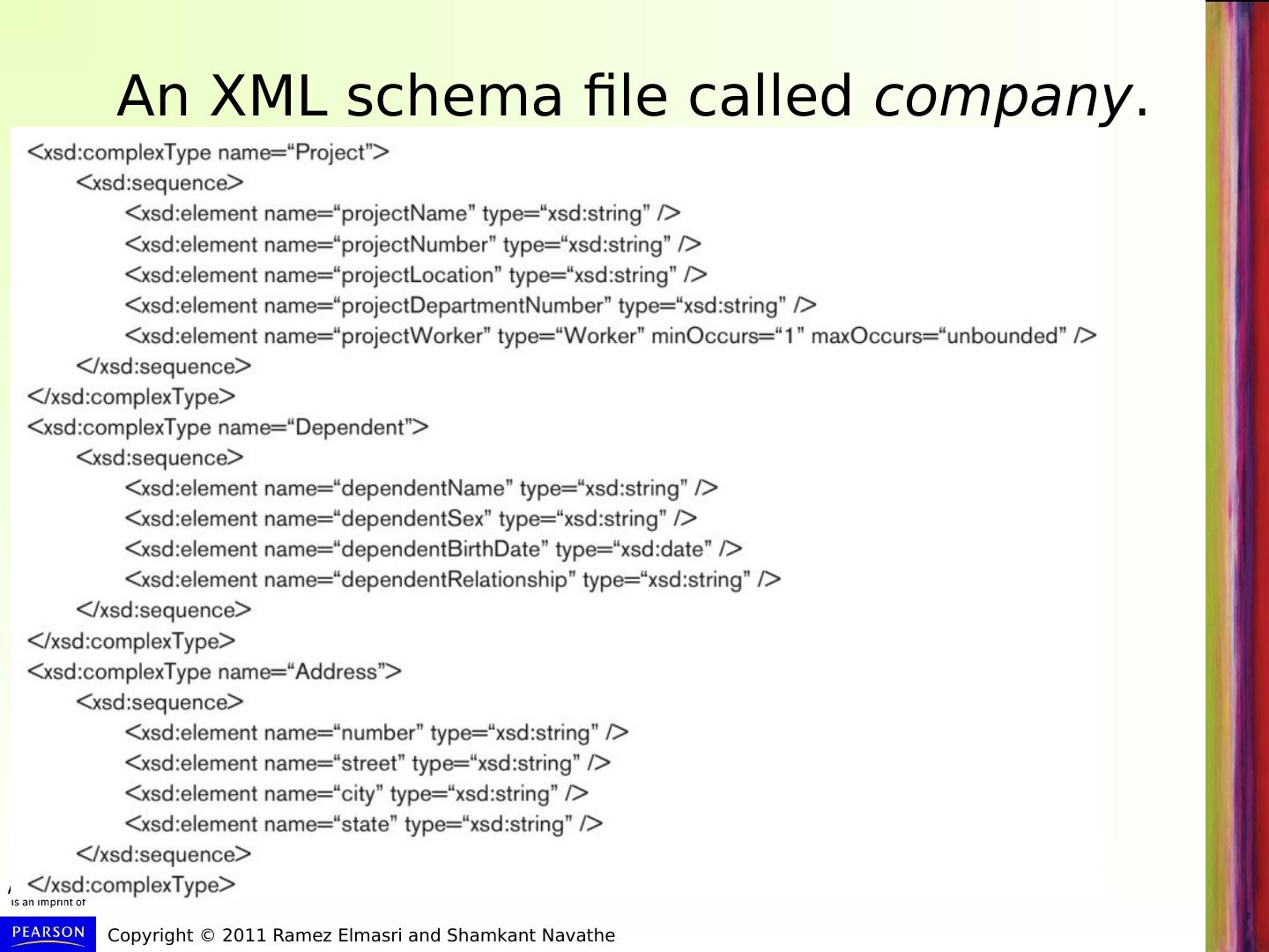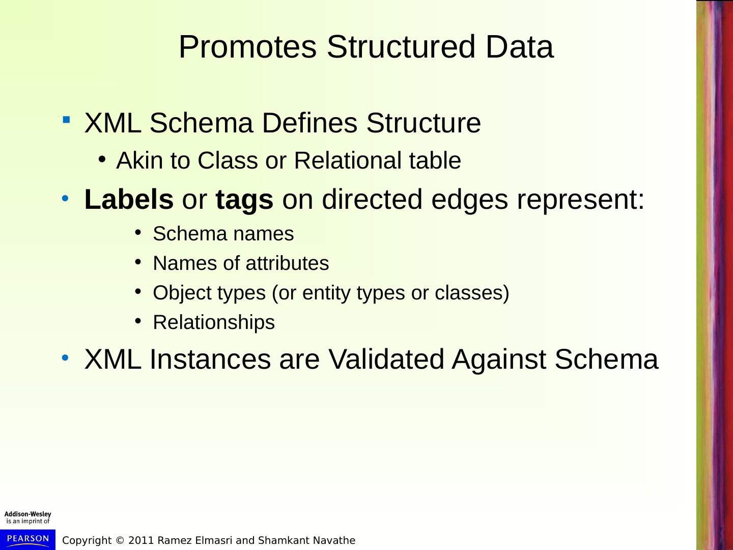 16 .Promotes Structured Data XML Schema Defines Structure Akin to Class or Relational table Labels or tags on directed edges represent: Schema names Names of attributes Object types (or entity types or classes) Relationships XML Instances are Validated Against Schema