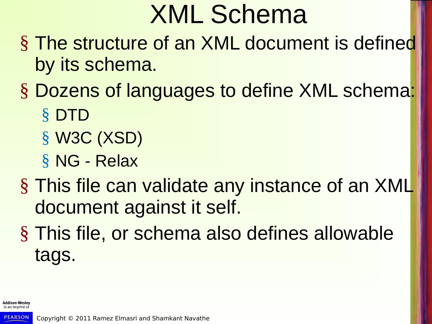 18 .XML Schema The structure of an XML document is defined by its schema. Dozens of languages to define XML schema: DTD W3C (XSD) NG - Relax This file can validate any instance of an XML document against it self. This file, or schema also defines allowable tags.