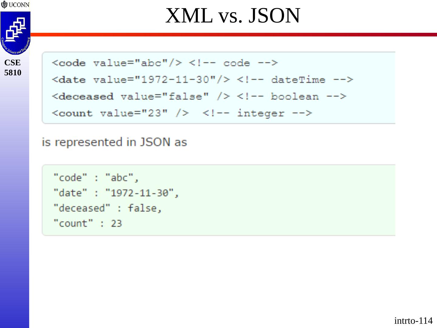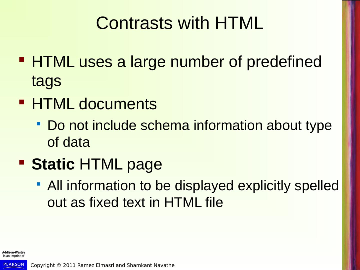 22 .Contrasts with HTML HTML uses a large number of predefined tags HTML documents Do not include schema information about type of data Static HTML page All information to be displayed explicitly spelled out as fixed text in HTML file