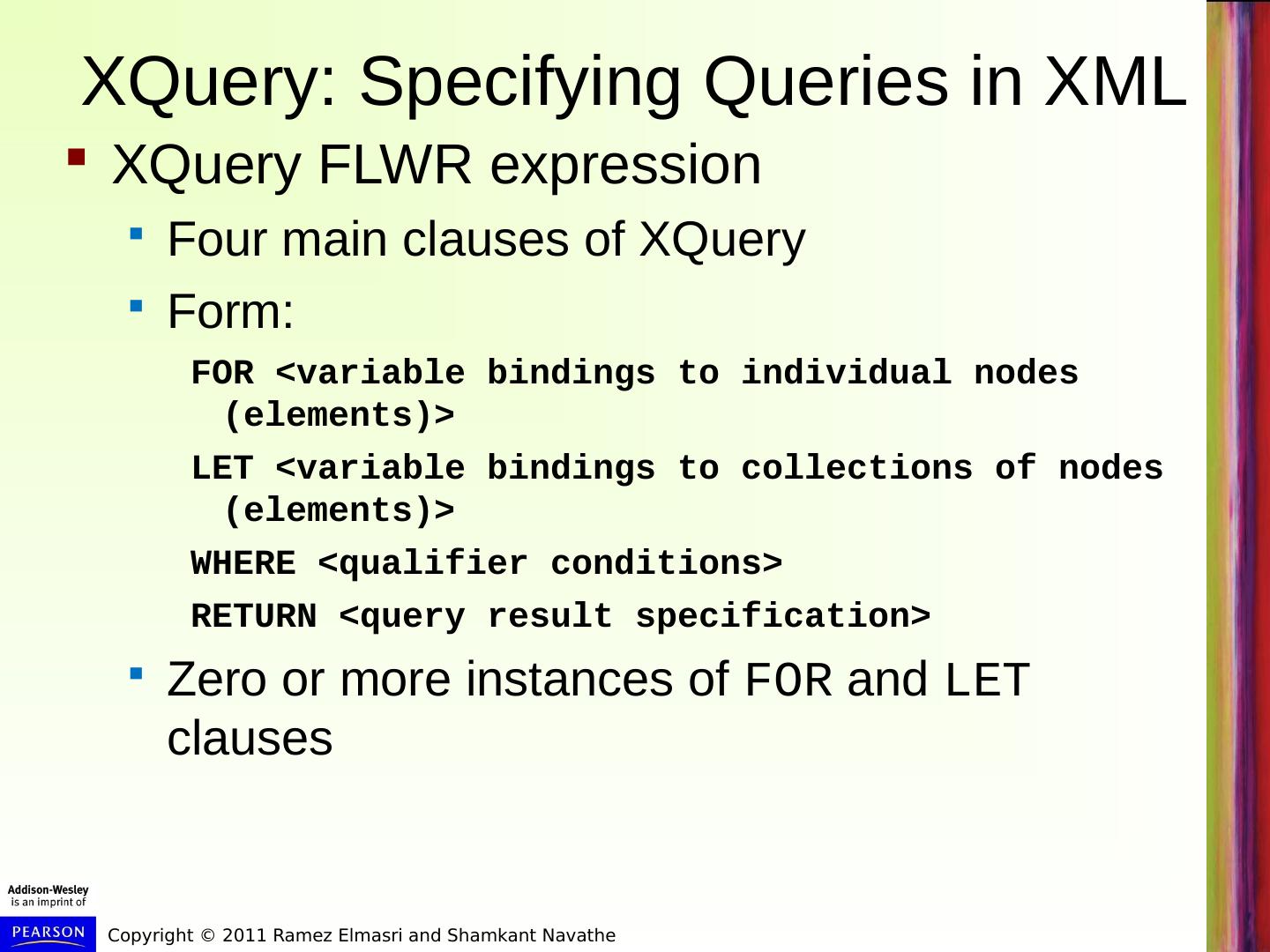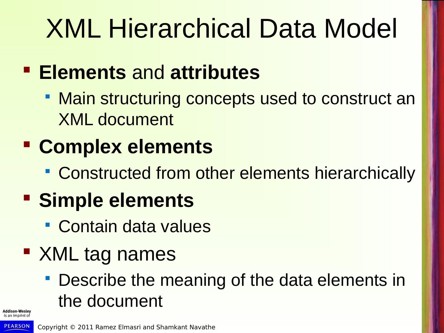 25 .XML Hierarchical Data Model Elements and attributes Main structuring concepts used to construct an XML document Complex elements Constructed from other elements hierarchically Simple elements Contain data values XML tag names Describe the meaning of the data elements in the document