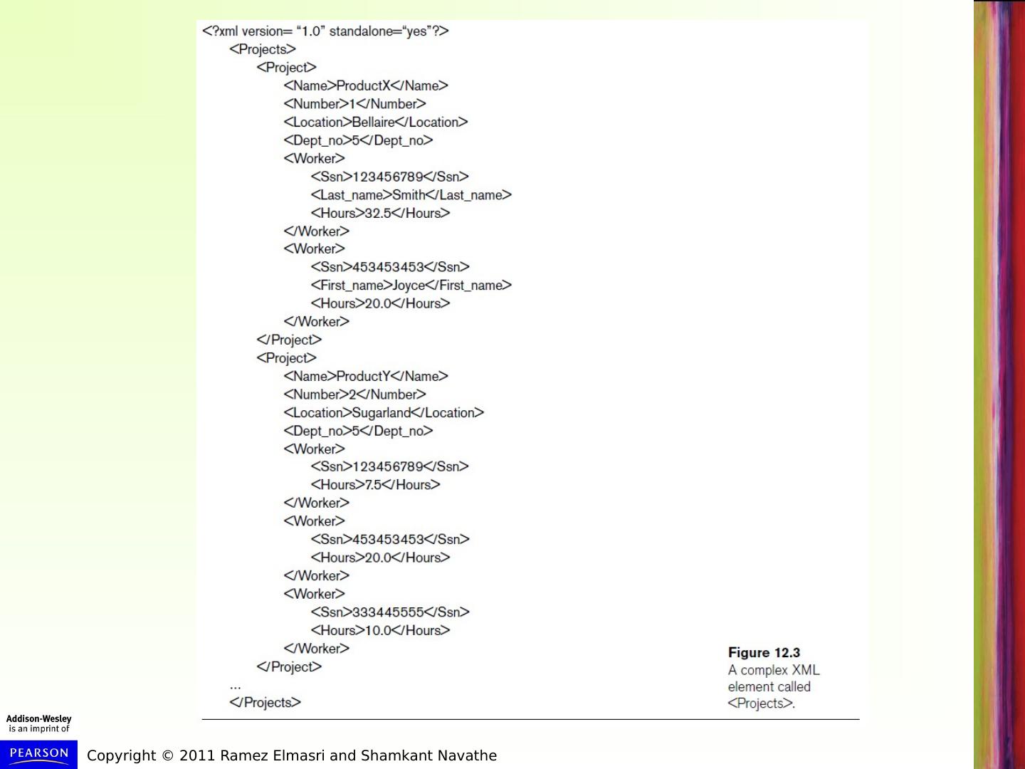 24 .XML Hierarchical Data Model Elements and attributes Main structuring concepts used to construct an XML document Complex elements Constructed from other elements hierarchically Simple elements Contain data values XML tag names Describe the meaning of the data elements in the document