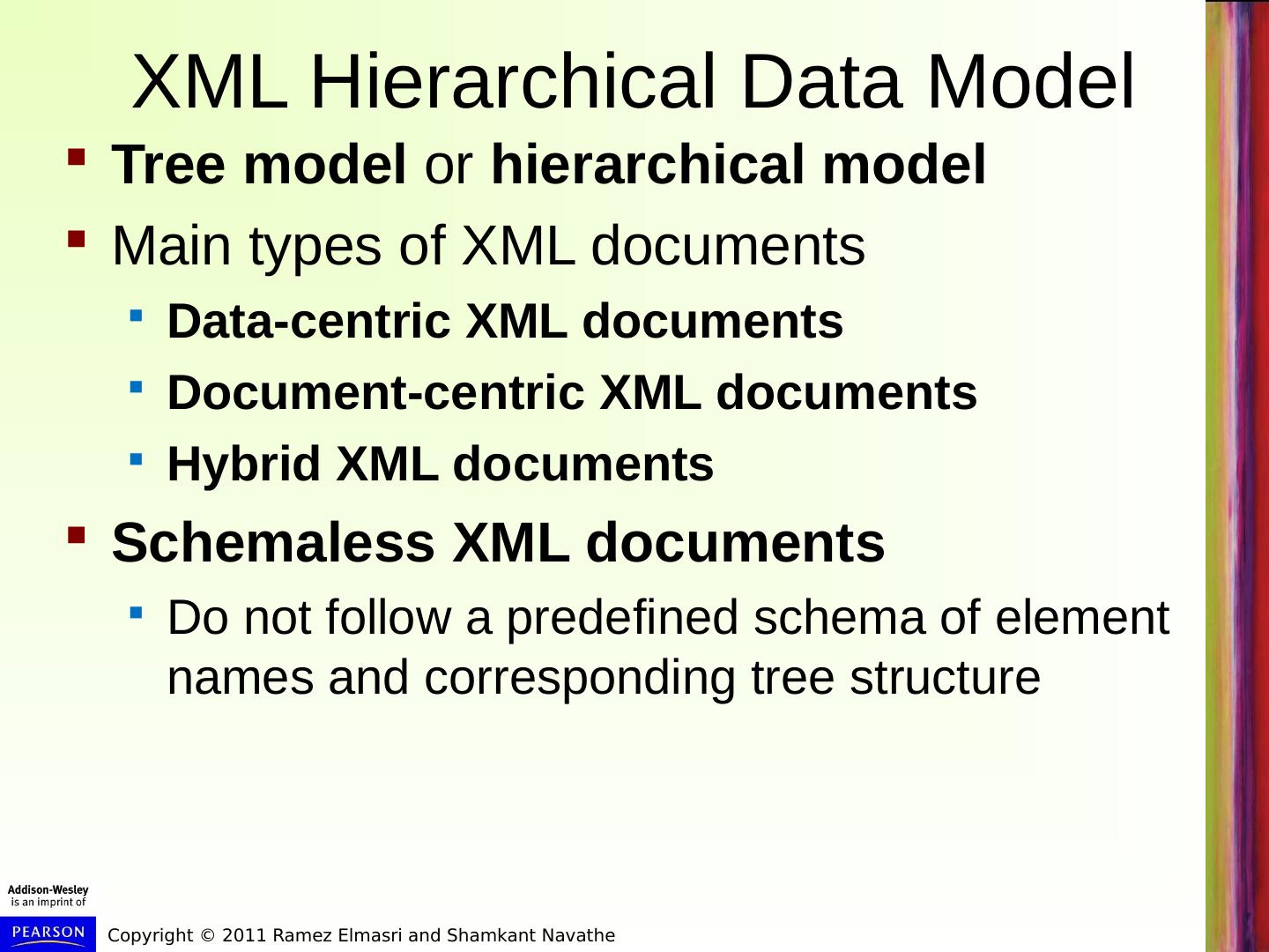 26 .XML Hierarchical Data Model Tree model or hierarchical model Main types of XML documents Data-centric XML documents Document-centric XML documents Hybrid XML documents Schemaless XML documents Do not follow a predefined schema of element names and corresponding tree structure