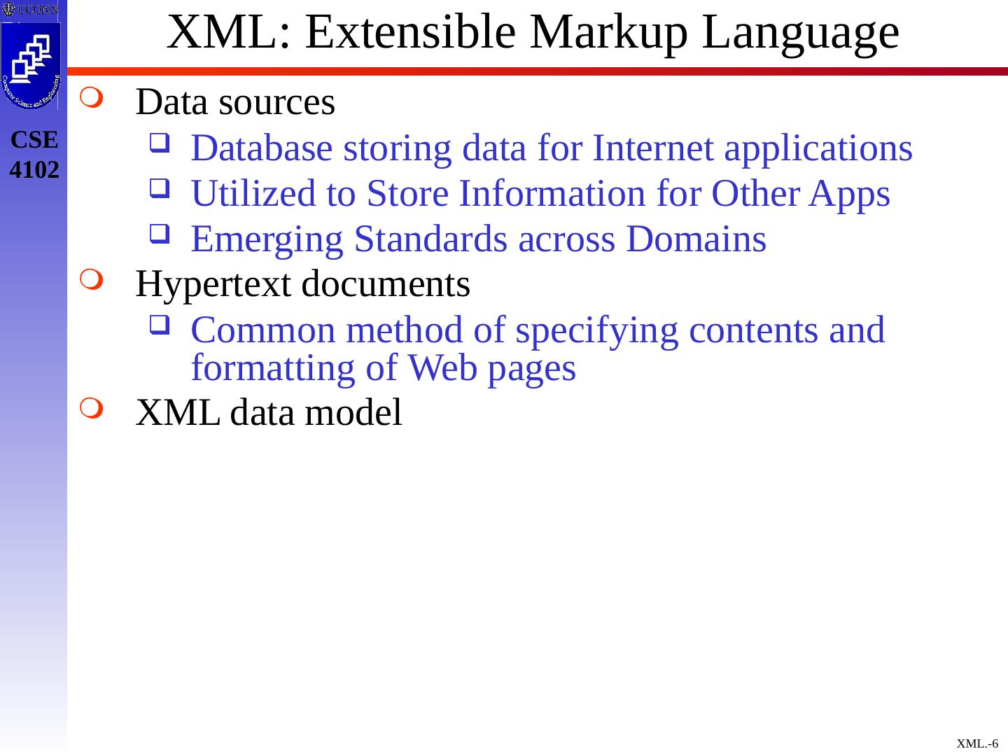 6 .XML: Extensible Markup Language Data sources Database storing data for Internet applications Utilized to Store Information for Other Apps Emerging Standards across Domains Hypertext documents Common method of specifying contents and formatting of Web pages XML data model