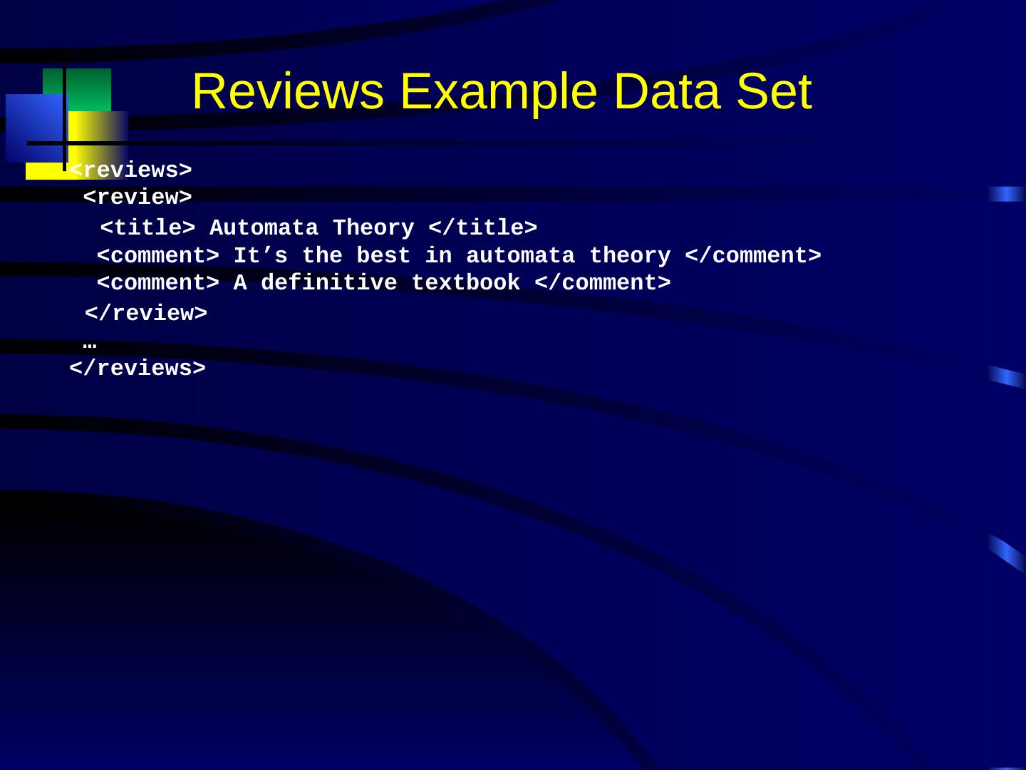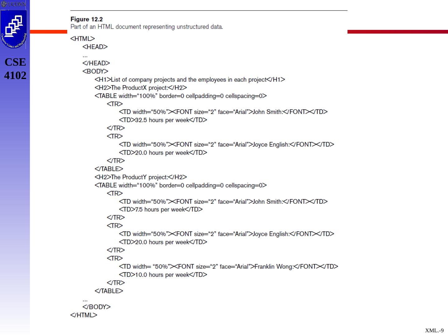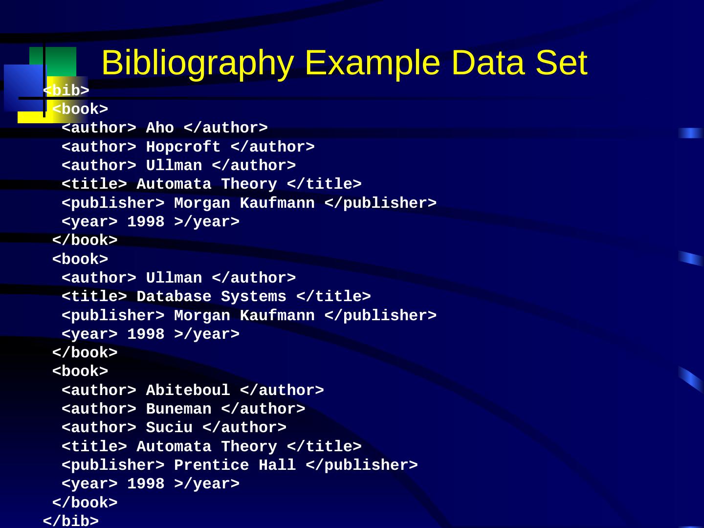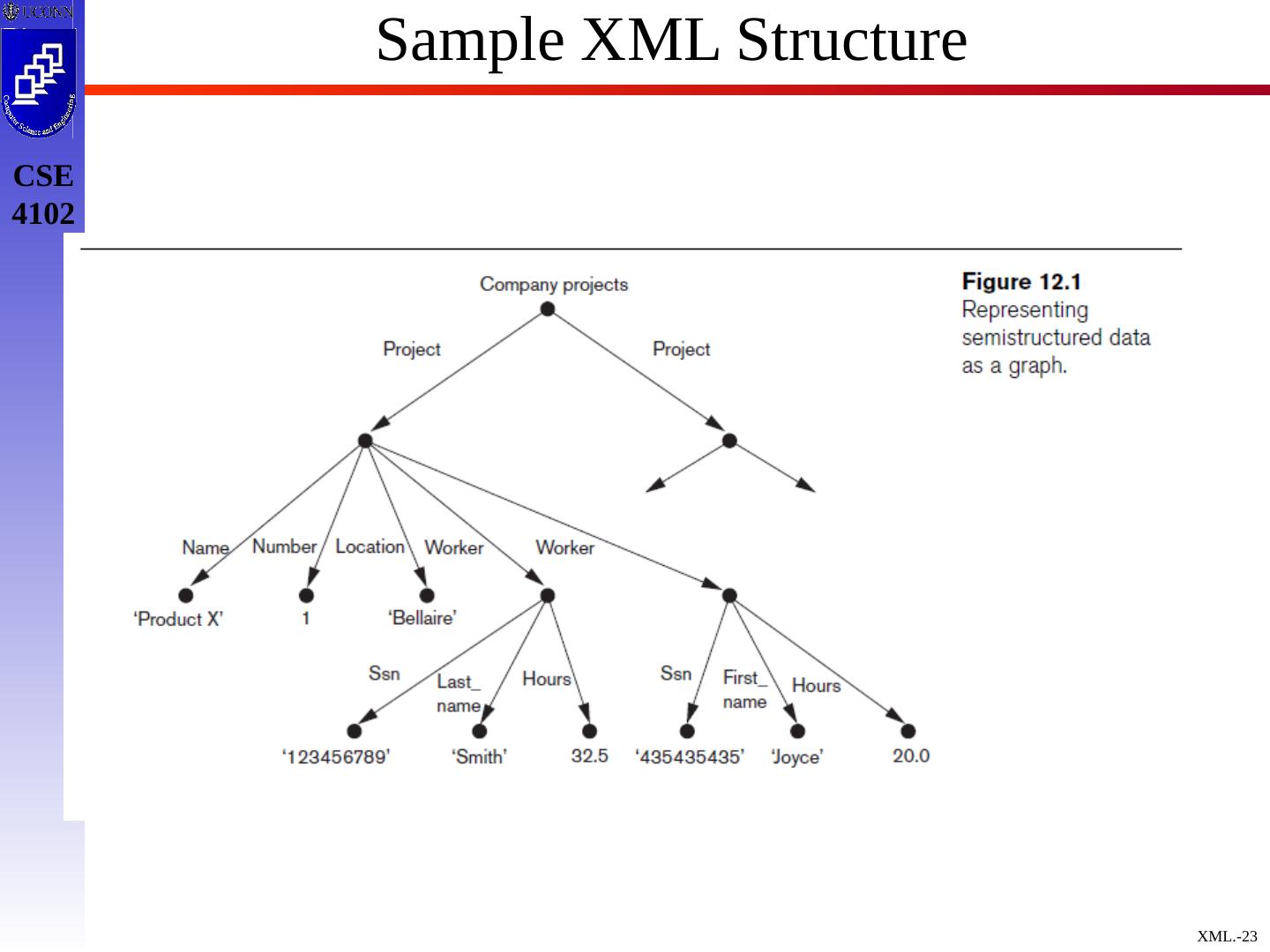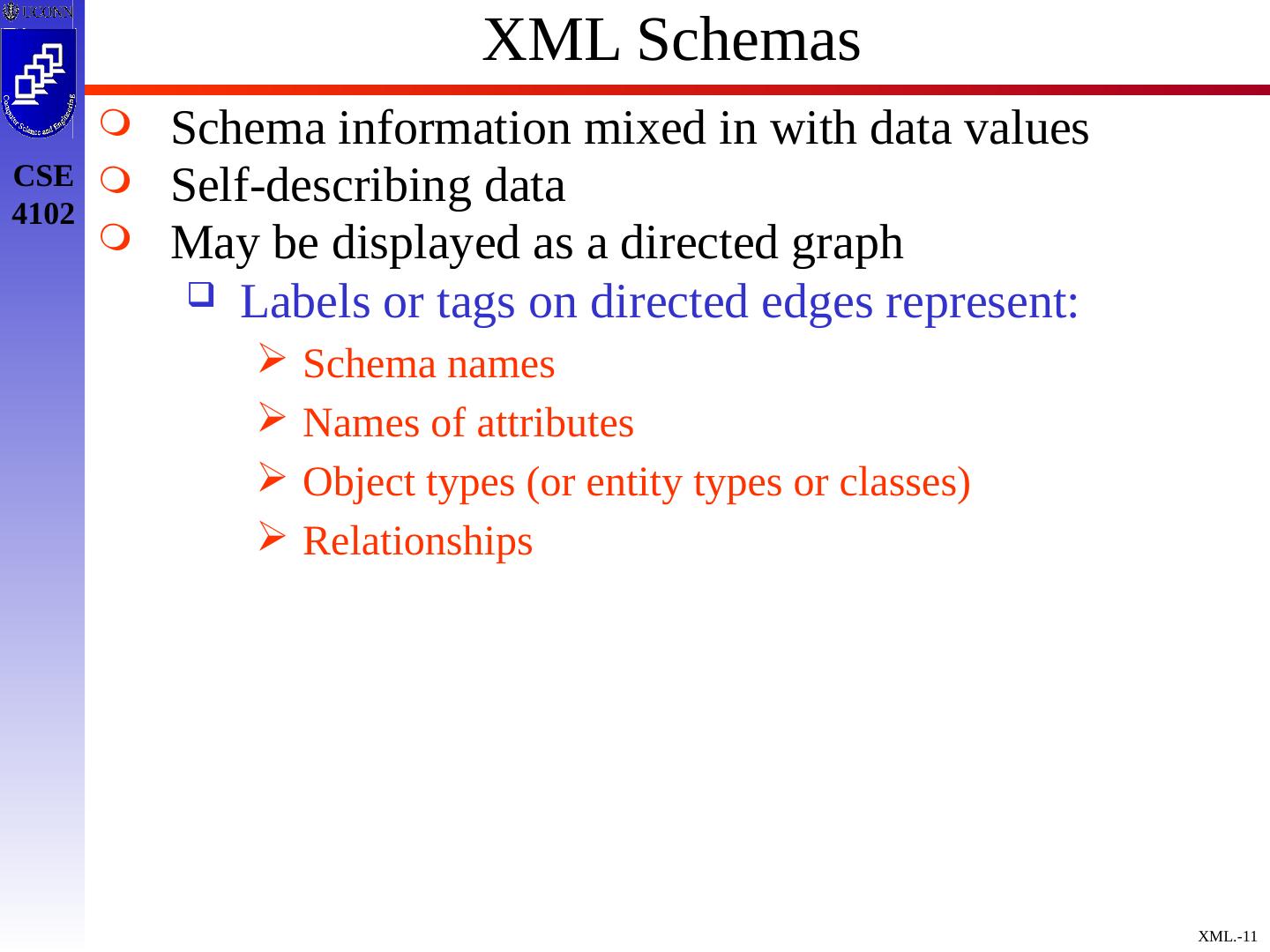 11 .XML Schemas Schema information mixed in with data values Self-describing data May be displayed as a directed graph Labels or tags on directed edges represent: Schema names Names of attributes Object types (or entity types or classes) Relationships