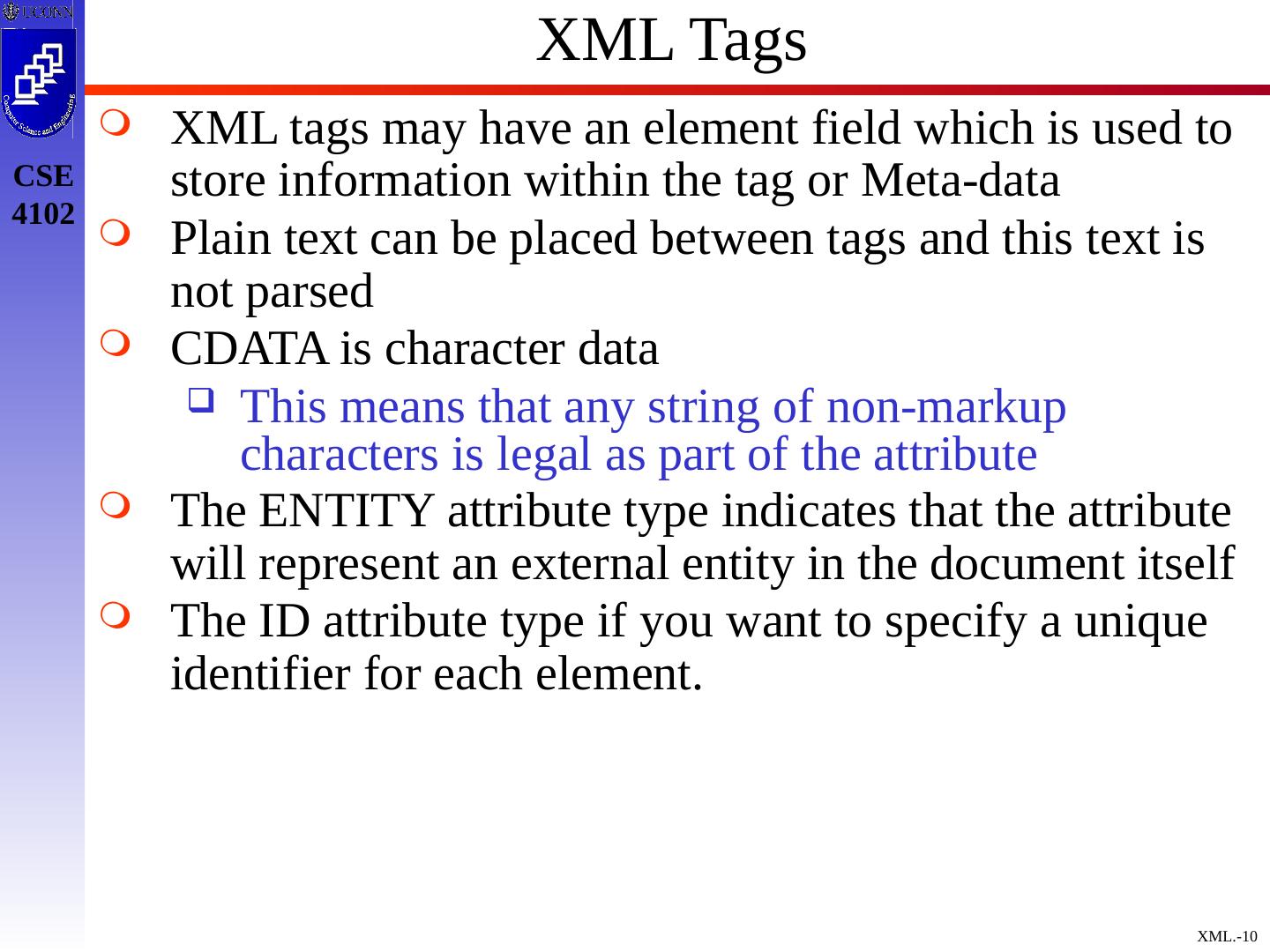 10 .XML Tags XML tags may have an element field which is used to store information within the tag or Meta-data Plain text can be placed between tags and this text is not parsed CDATA is character data This means that any string of non-markup characters is legal as part of the attribute The ENTITY attribute type indicates that the attribute will represent an external entity in the document itself The ID attribute type if you want to specify a unique identifier for each element.