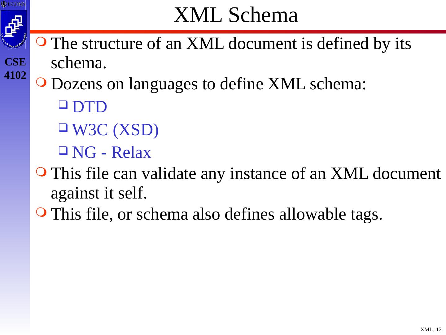 12 .XML Schema The structure of an XML document is defined by its schema. Dozens on languages to define XML schema: DTD W3C (XSD) NG - Relax This file can validate any instance of an XML document against it self. This file, or schema also defines allowable tags.
