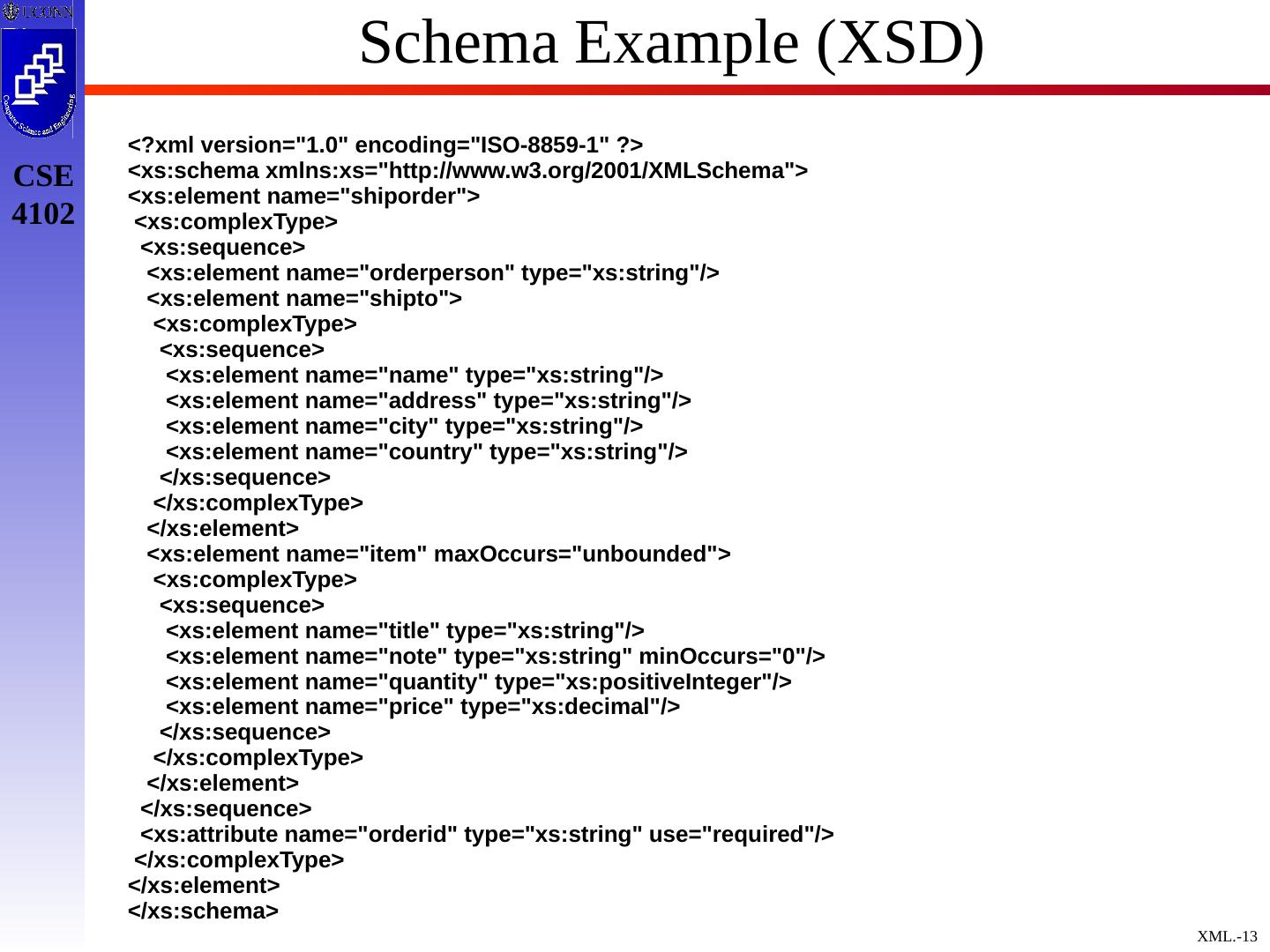 13 .Schema Example (XSD) <?xml version="1.0" encoding="ISO-8859-1" ?> <xs:schema xmlns:xs="http://www.w3.org/2001/XMLSchema"> <xs:element name="shiporder"> <xs:complexType> <xs:sequence> <xs:element name="orderperson" type="xs:string"/> <xs:element name="shipto"> <xs:complexType> <xs:sequence> <xs:element name="name" type="xs:string"/> <xs:element name="address" type="xs:string"/> <xs:element name="city" type="xs:string"/> <xs:element name="country" type="xs:string"/> </xs:sequence> </xs:complexType> </xs:element> <xs:element name="item" maxOccurs="unbounded"> <xs:complexType> <xs:sequence> <xs:element name="title" type="xs:string"/> <xs:element name="note" type="xs:string" minOccurs="0"/> <xs:element name="quantity" type="xs:positiveInteger"/> <xs:element name="price" type="xs:decimal"/> </xs:sequence> </xs:complexType> </xs:element> </xs:sequence> <xs:attribute name="orderid" type="xs:string" use="required"/> </xs:complexType> </xs:element> </xs:schema>
