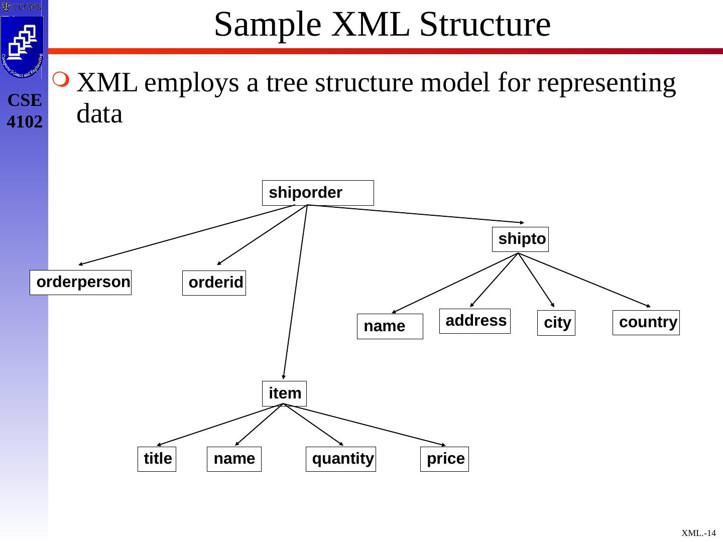 14 .Sample XML Structure XML employs a tree structure model for representing data shiporder orderperson shipto name address city country item title name quantity price orderid