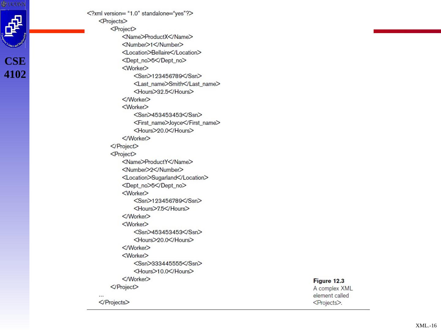15 .XML Hierarchical Data Model Elements and attributes Main structuring concepts used to construct an XML document Complex elements Constructed from other elements hierarchically Simple elements Contain data values XML tag names Describe the meaning of the data elements in the document