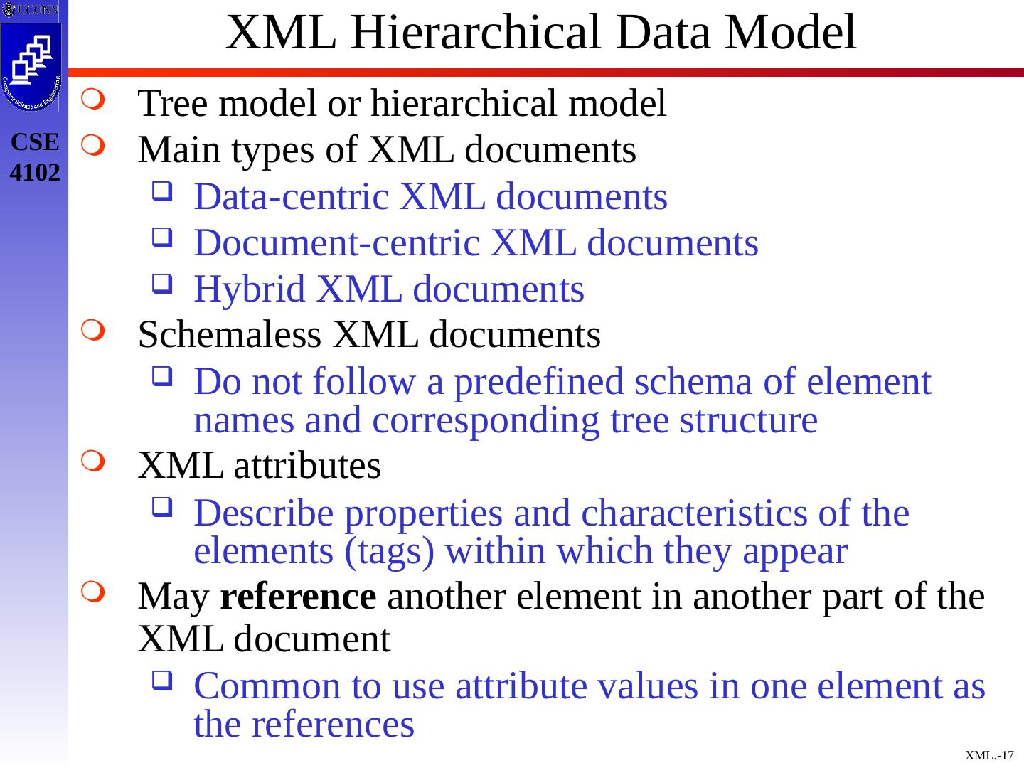17 .XML Hierarchical Data Model Tree model or hierarchical model Main types of XML documents Data-centric XML documents Document-centric XML documents Hybrid XML documents Schemaless XML documents Do not follow a predefined schema of element names and corresponding tree structure XML attributes Describe properties and characteristics of the elements (tags) within which they appear May reference another element in another part of the XML document Common to use attribute values in one element as the references