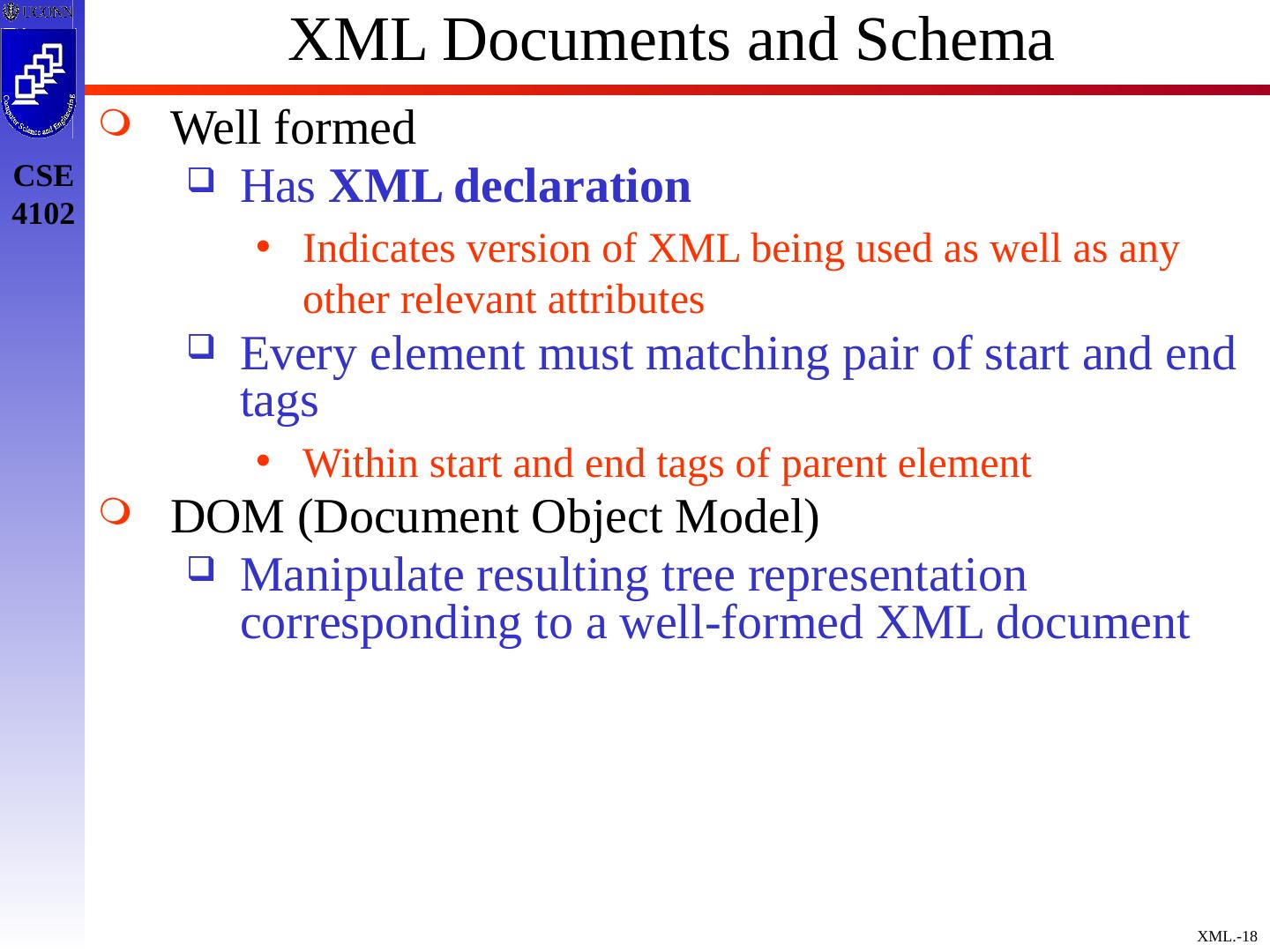 18 .XML Documents and Schema Well formed Has XML declaration Indicates version of XML being used as well as any other relevant attributes Every element must matching pair of start and end tags Within start and end tags of parent element DOM (Document Object Model) Manipulate resulting tree representation corresponding to a well-formed XML document