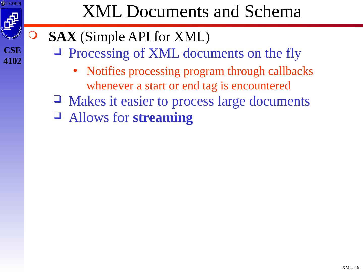 19 .XML Documents and Schema SAX (Simple API for XML) Processing of XML documents on the fly Notifies processing program through callbacks whenever a start or end tag is encountered Makes it easier to process large documents Allows for streaming