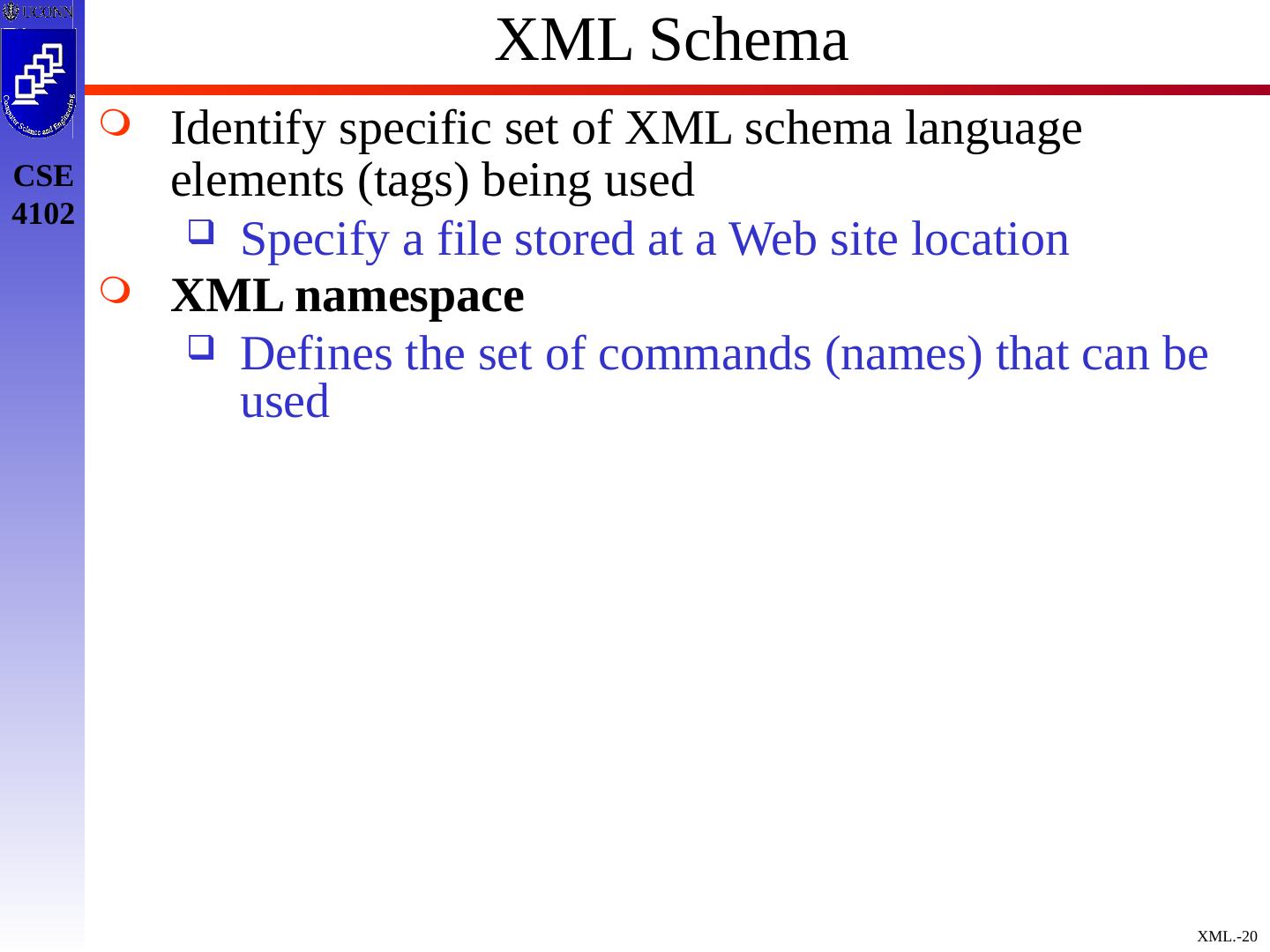 20 .XML Schema Identify specific set of XML schema language elements (tags) being used Specify a file stored at a Web site location XML namespace Defines the set of commands (names) that can be used