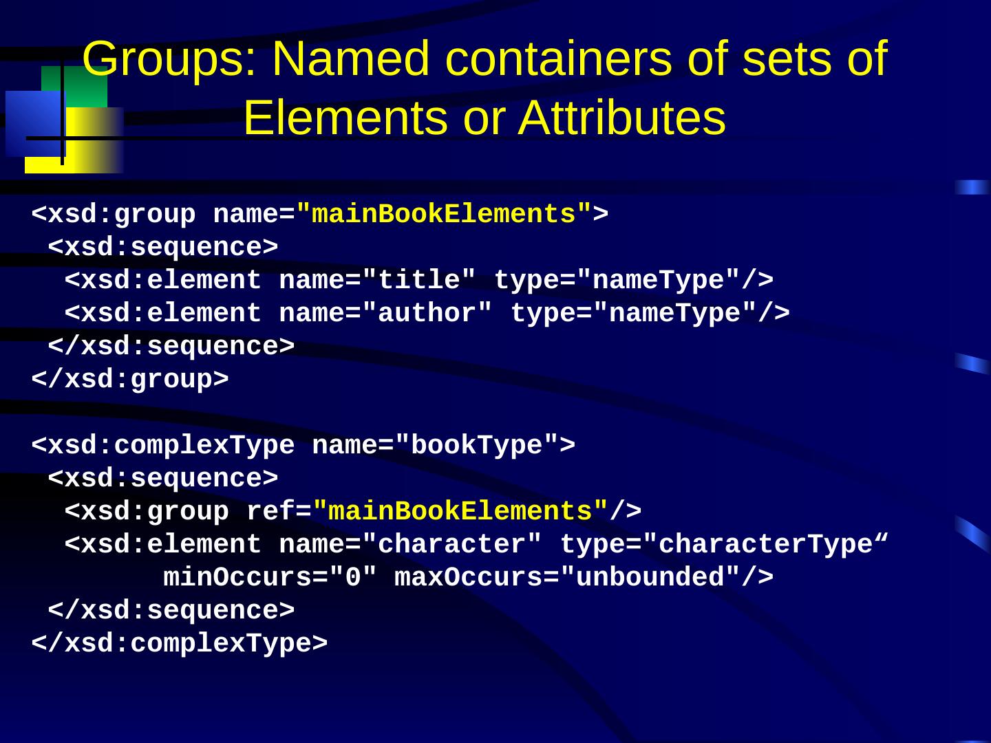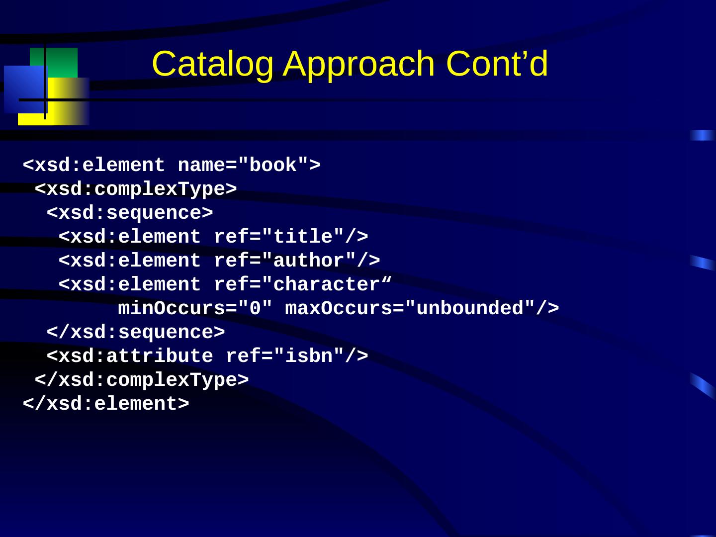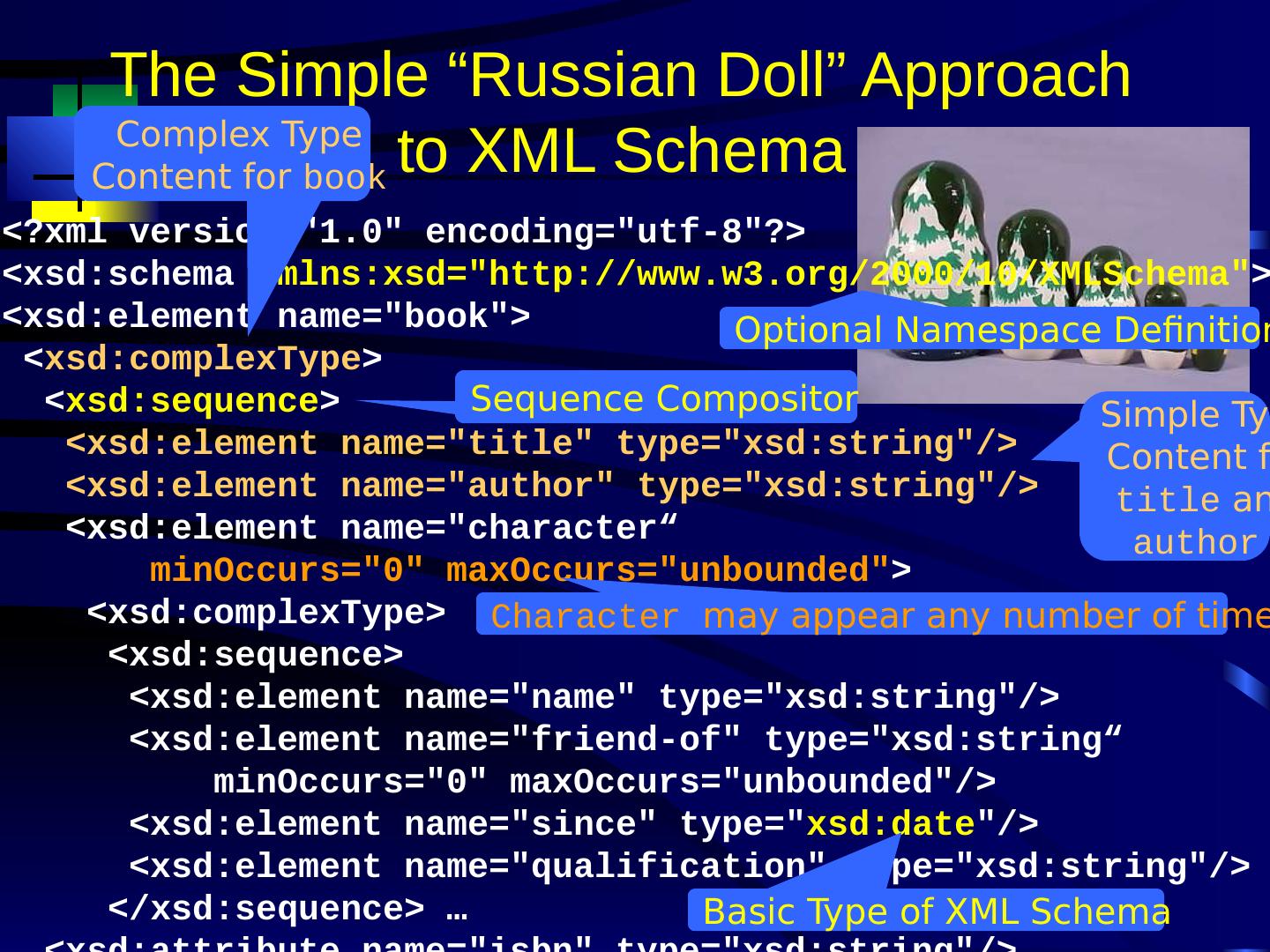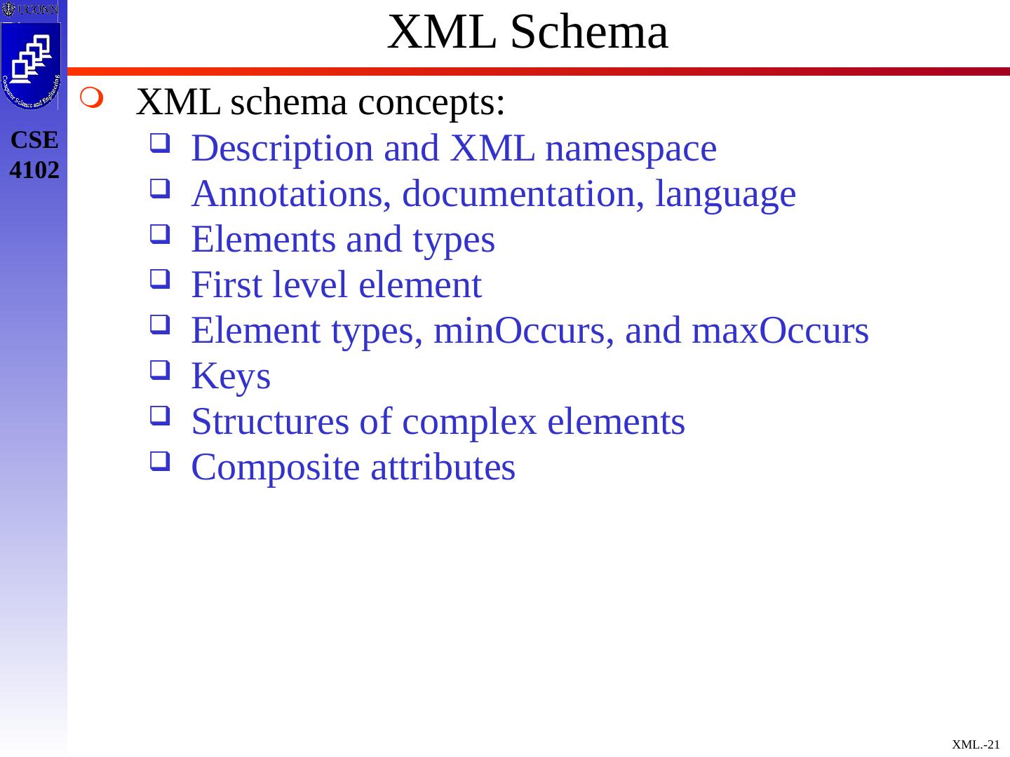 23 .XML Schema XML schema concepts: Description and XML namespace Annotations, documentation, language Elements and types First level element Element types, minOccurs, and maxOccurs Keys Structures of complex elements Composite attributes