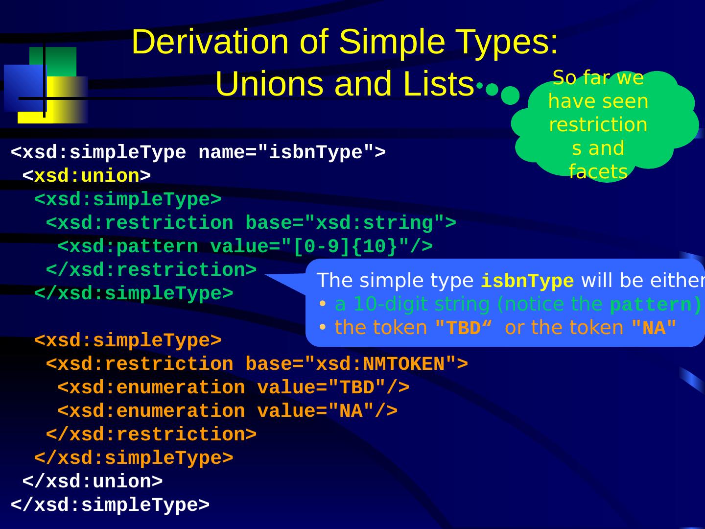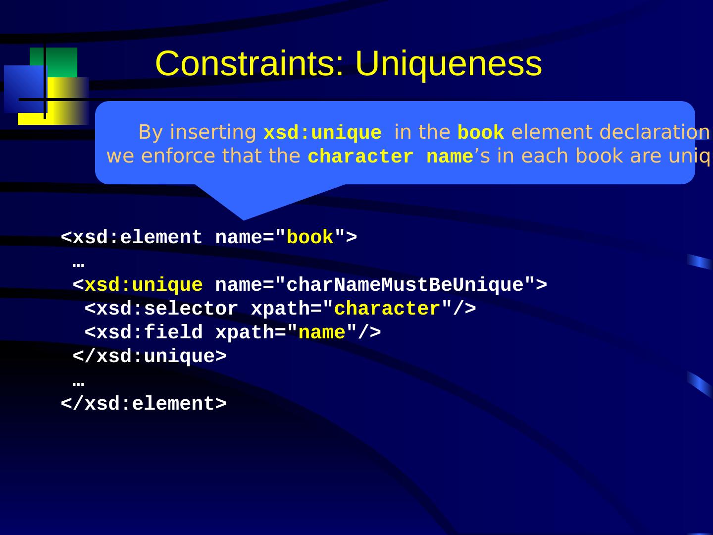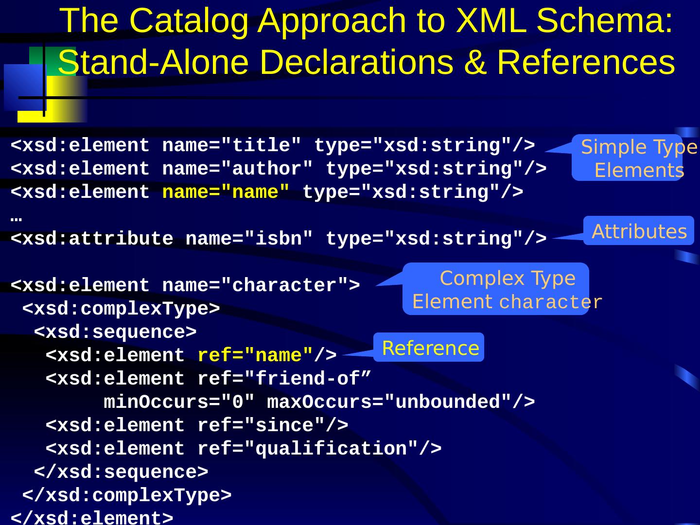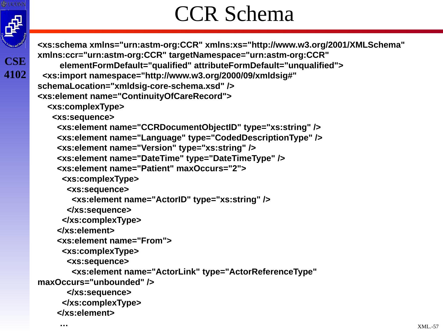 23 .XML Schema XML schema concepts: Description and XML namespace Annotations, documentation, language Elements and types First level element Element types, minOccurs, and maxOccurs Keys Structures of complex elements Composite attributes
