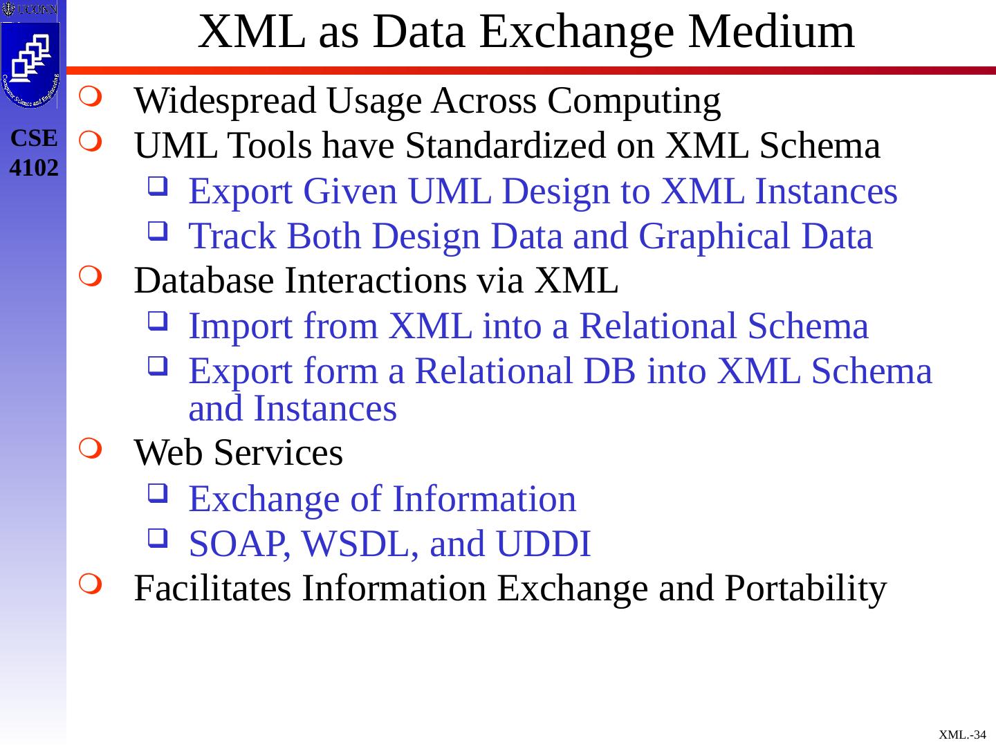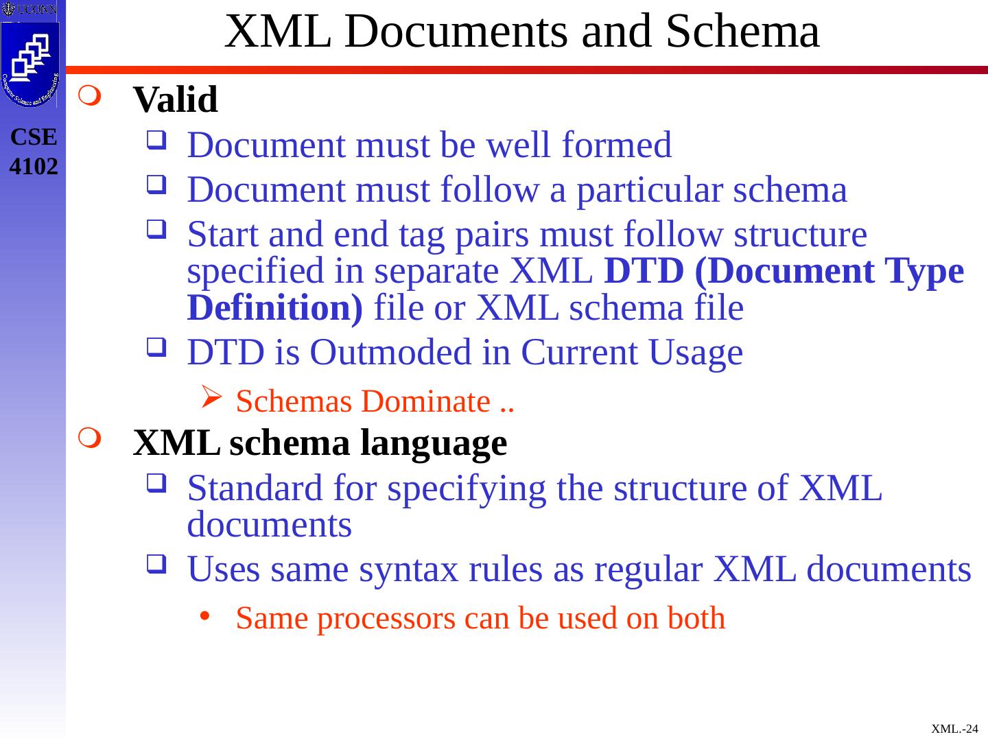 24 .XML Documents and Schema Valid Document must be well formed Document must follow a particular schema Start and end tag pairs must follow structure specified in separate XML DTD (Document Type Definition) file or XML schema file DTD is Outmoded in Current Usage Schemas Dominate .. XML schema language Standard for specifying the structure of XML documents Uses same syntax rules as regular XML documents Same processors can be used on both