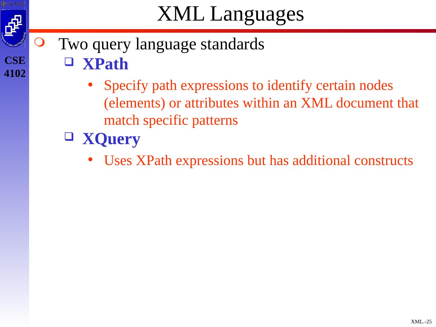 25 .XML Languages Two query language standards XPath Specify path expressions to identify certain nodes (elements) or attributes within an XML document that match specific patterns XQuery Uses XPath expressions but has additional constructs
