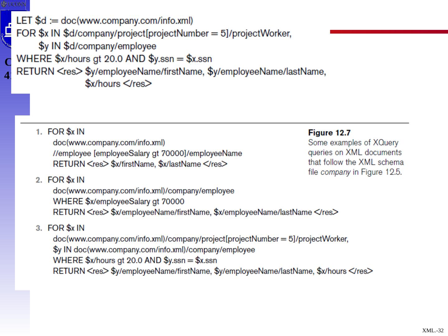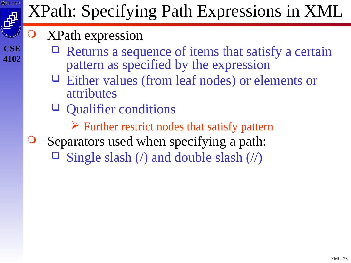 26 .XPath: Specifying Path Expressions in XML XPath expression Returns a sequence of items that satisfy a certain pattern as specified by the expression Either values (from leaf nodes) or elements or attributes Qualifier conditions Further restrict nodes that satisfy pattern Separators used when specifying a path: Single slash (/) and double slash (//)