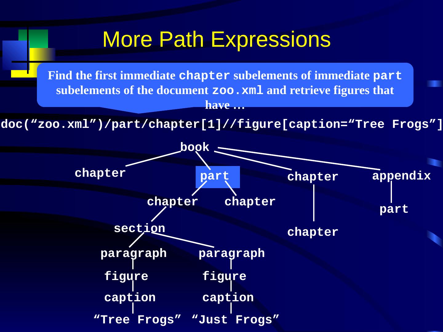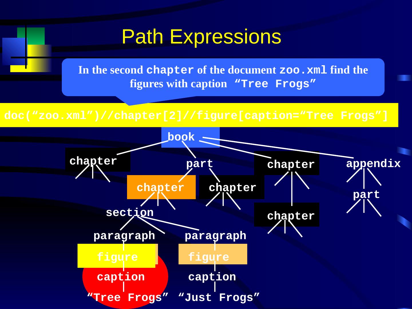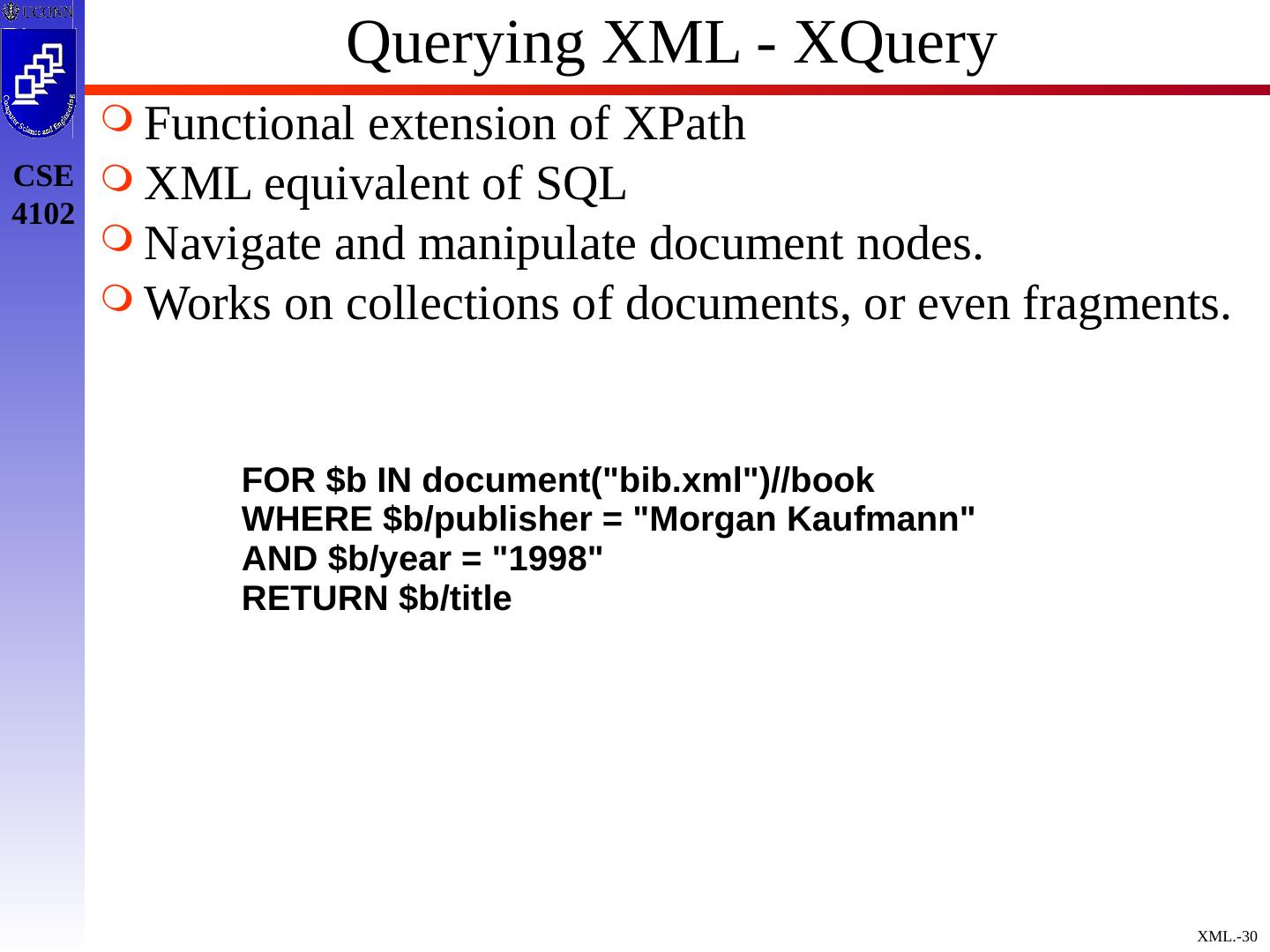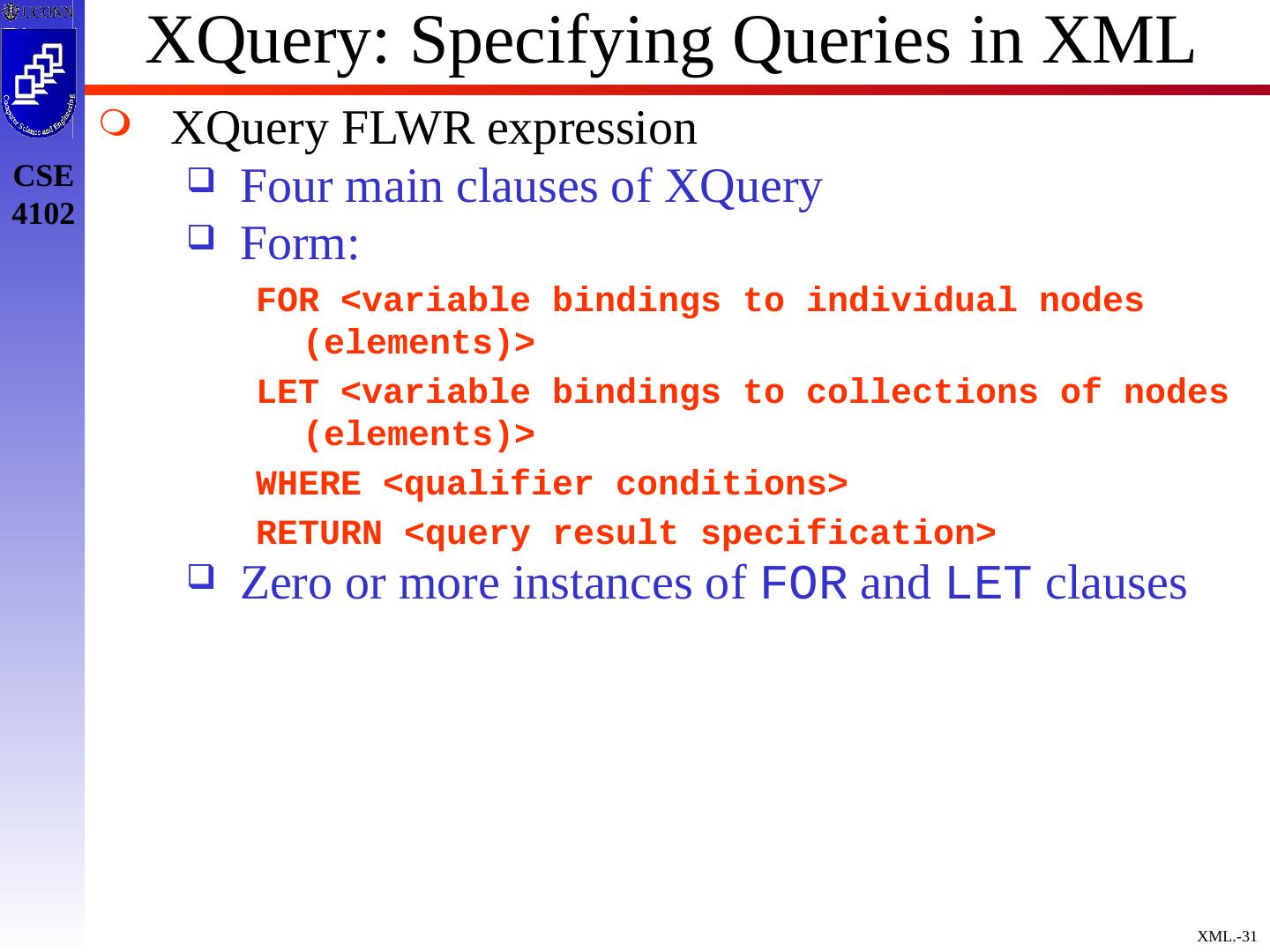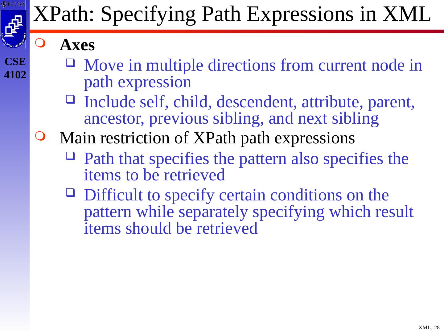 28 .XPath: Specifying Path Expressions in XML Axes Move in multiple directions from current node in path expression Include self, child, descendent, attribute, parent, ancestor, previous sibling, and next sibling Main restriction of XPath path expressions Path that specifies the pattern also specifies the items to be retrieved Difficult to specify certain conditions on the pattern while separately specifying which result items should be retrieved