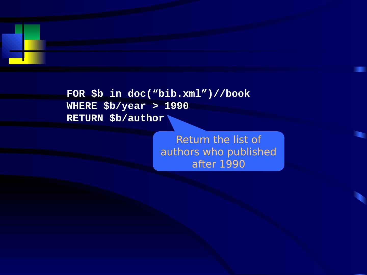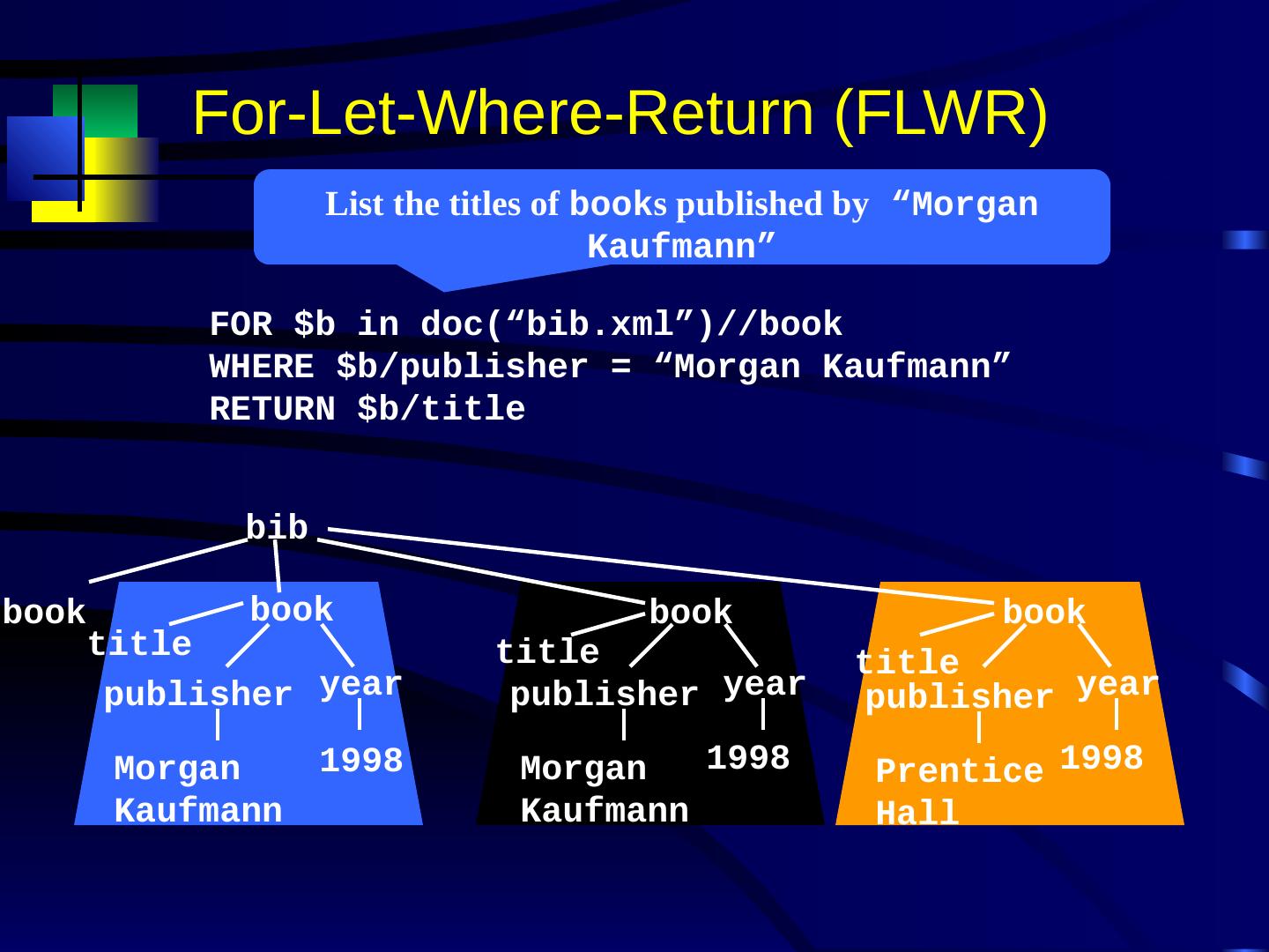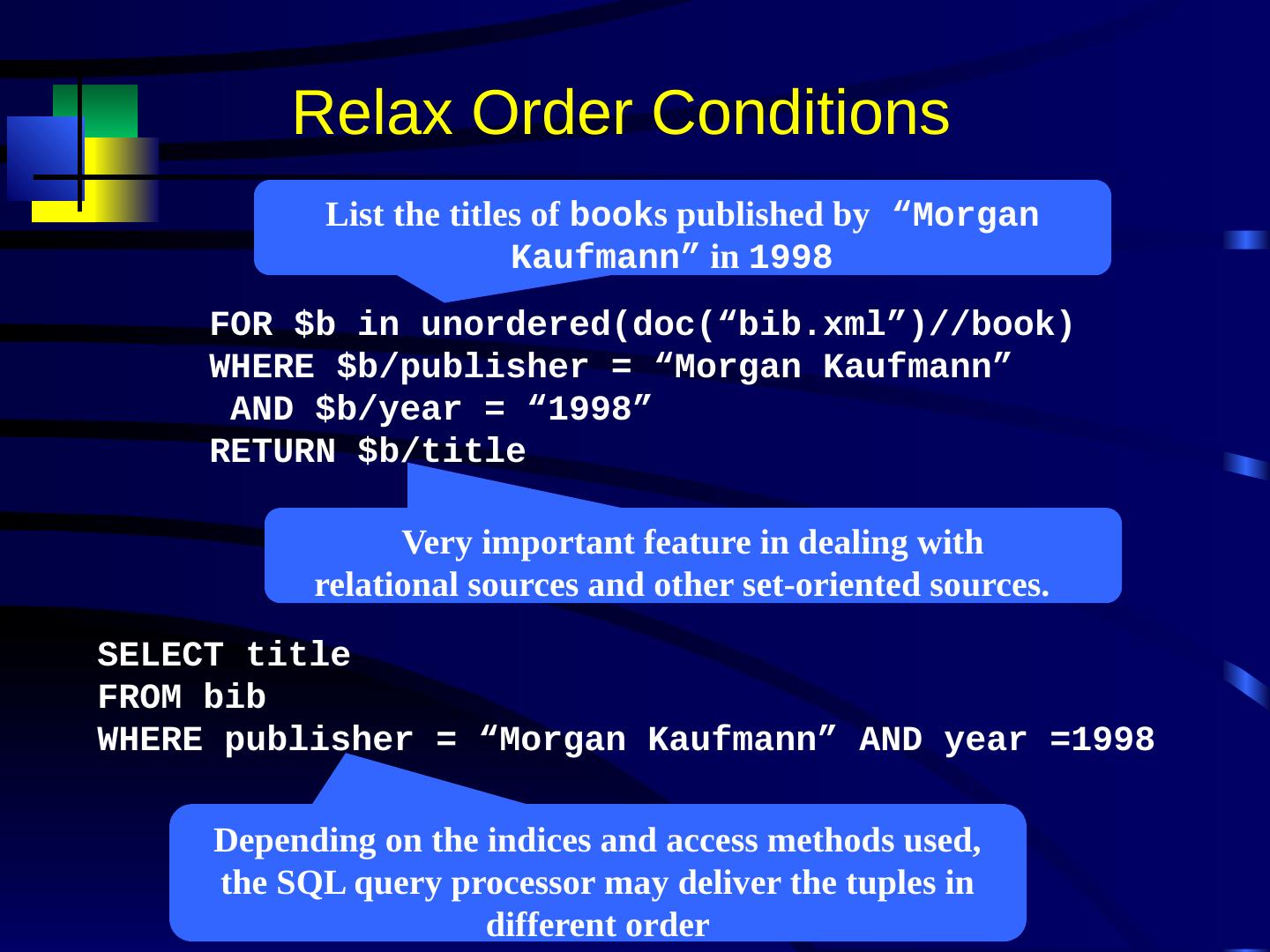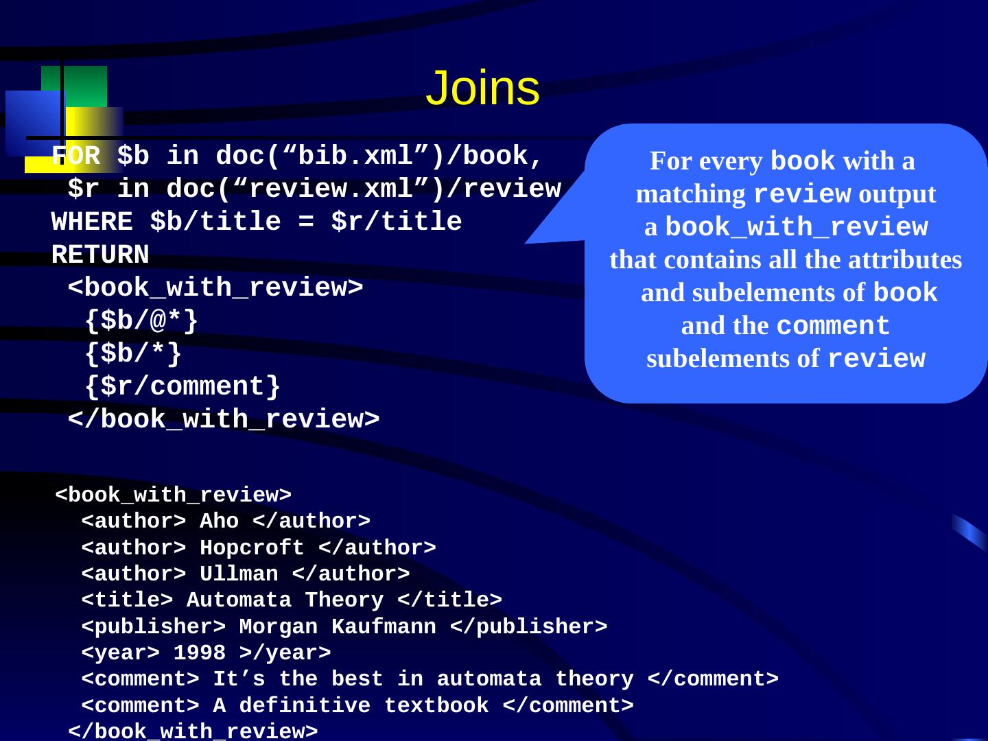 28 .XPath: Specifying Path Expressions in XML Axes Move in multiple directions from current node in path expression Include self, child, descendent, attribute, parent, ancestor, previous sibling, and next sibling Main restriction of XPath path expressions Path that specifies the pattern also specifies the items to be retrieved Difficult to specify certain conditions on the pattern while separately specifying which result items should be retrieved