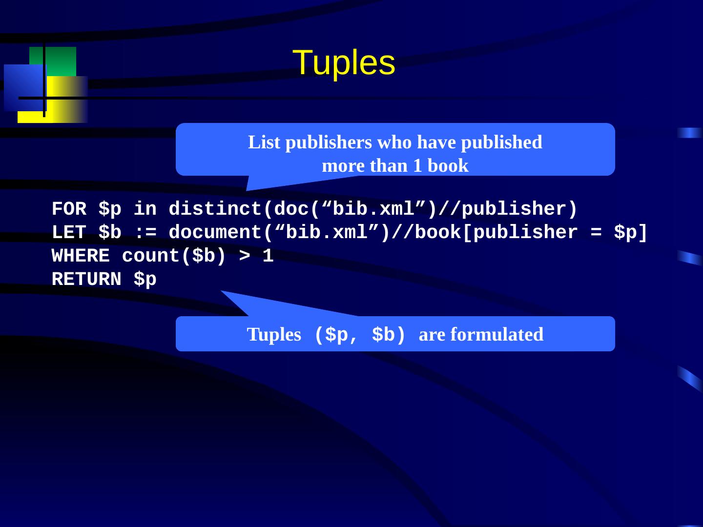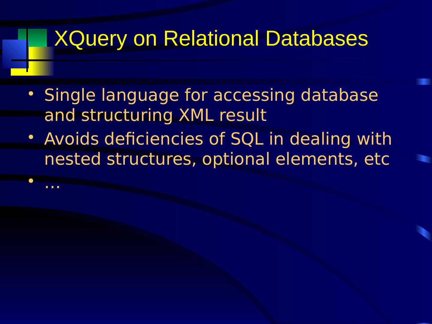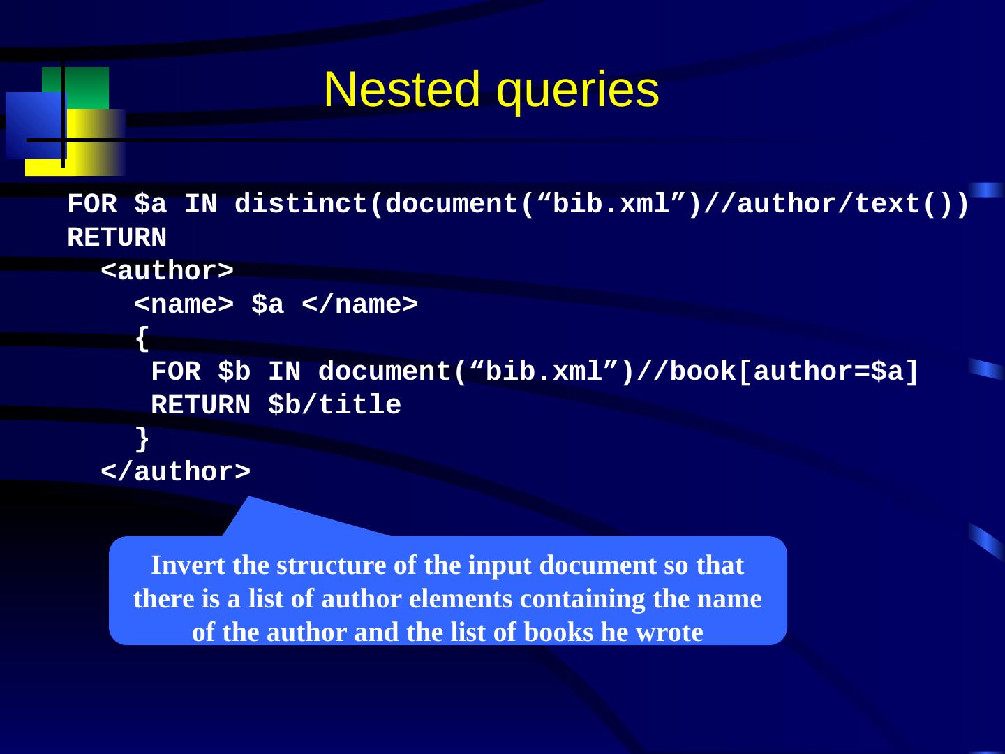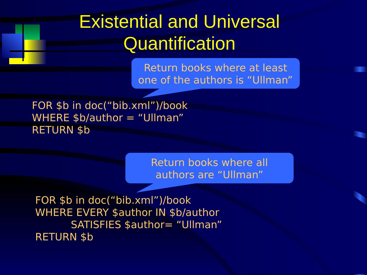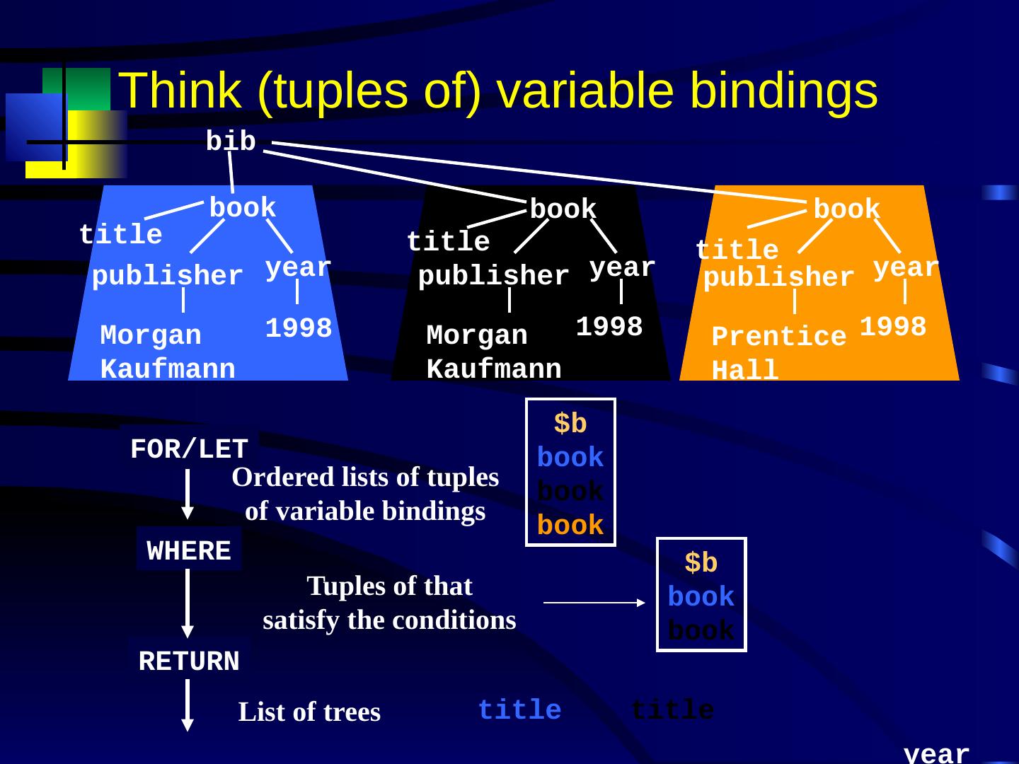 28 .XPath: Specifying Path Expressions in XML Axes Move in multiple directions from current node in path expression Include self, child, descendent, attribute, parent, ancestor, previous sibling, and next sibling Main restriction of XPath path expressions Path that specifies the pattern also specifies the items to be retrieved Difficult to specify certain conditions on the pattern while separately specifying which result items should be retrieved