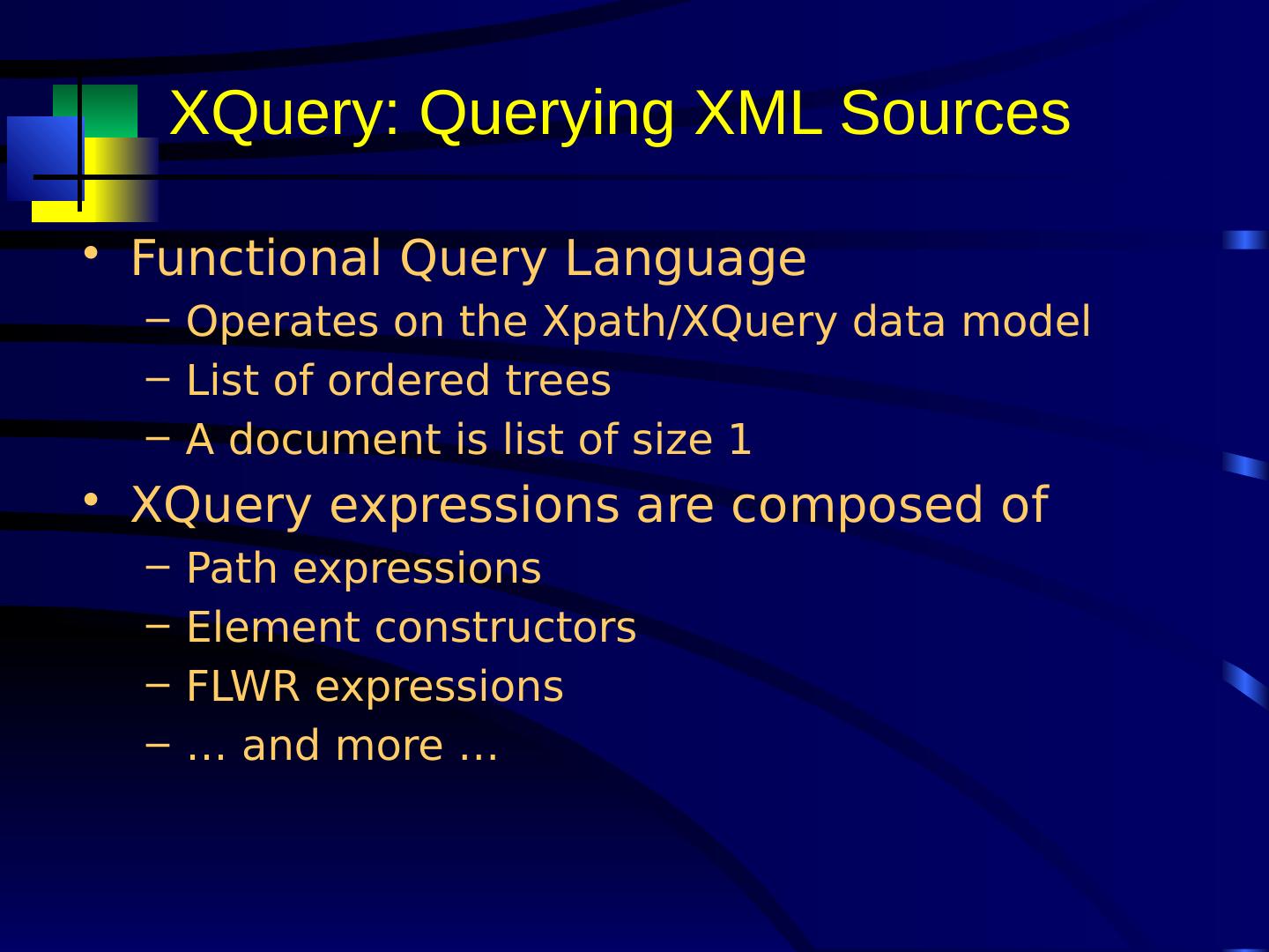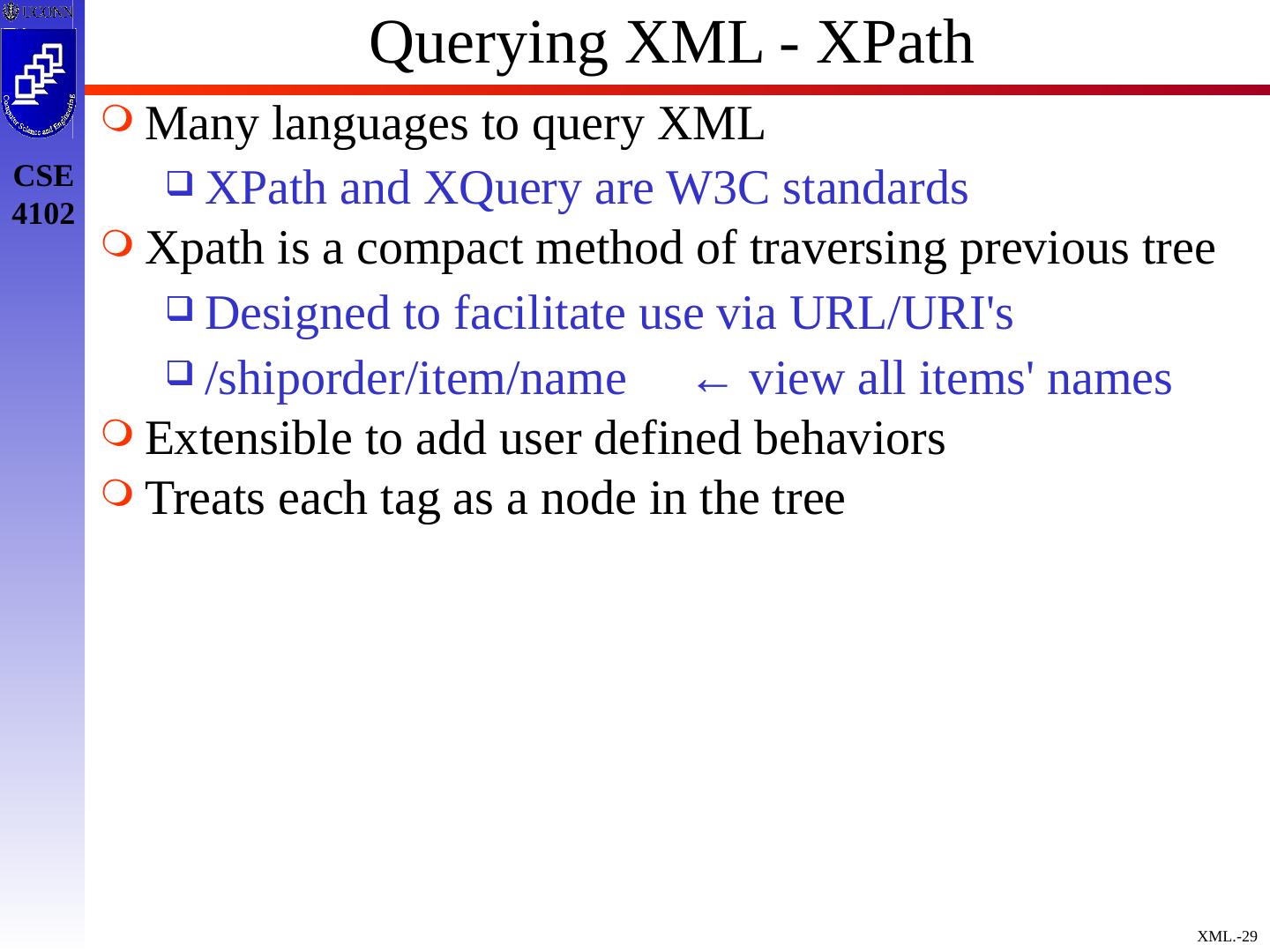 29 .Querying XML - XPath Many languages to query XML XPath and XQuery are W3C standards Xpath is a compact method of traversing previous tree Designed to facilitate use via URL/URIs / shiporder /item/name ← view all items names Extensible to add user defined behaviors Treats each tag as a node in the tree