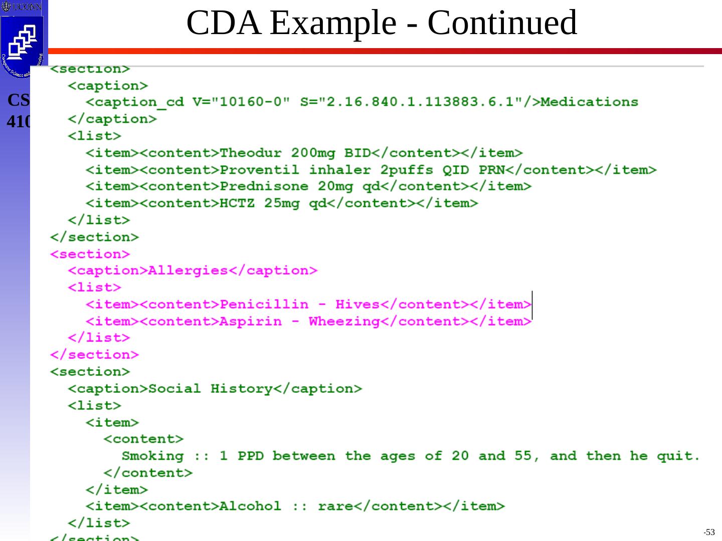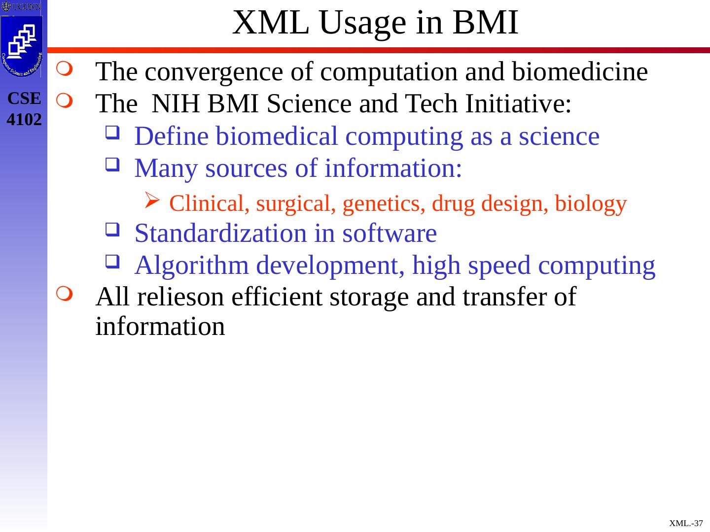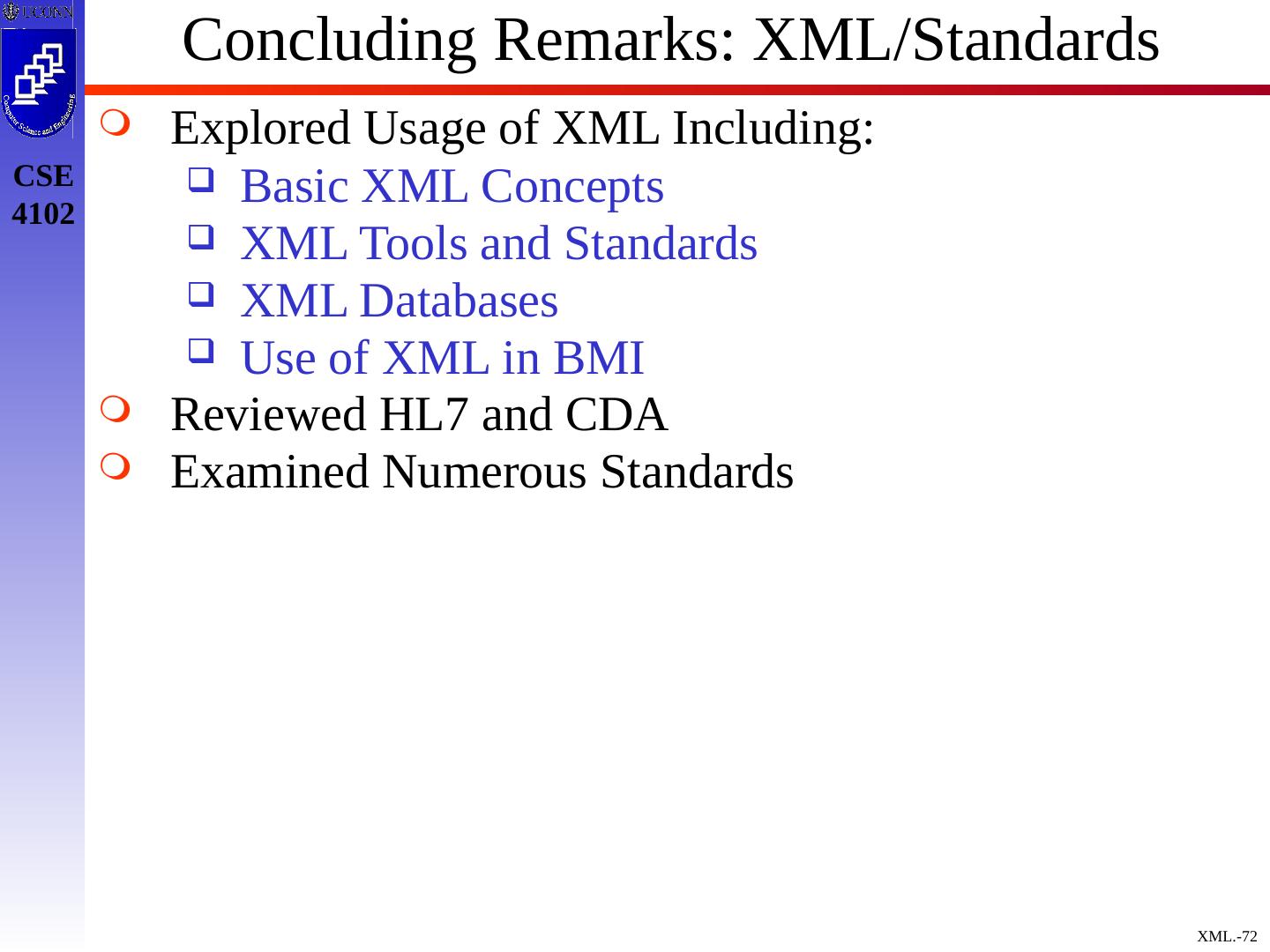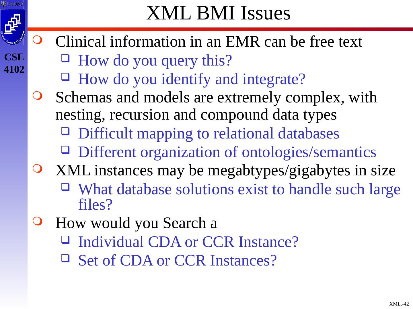 3 .Overview of XML XML Overview, Tags, schema. XML Query Languages: XPath &XQuery XML Data Models Biomedical Information and Databases BMI Standards and Examples: HL7 and CDA Survey of Technology