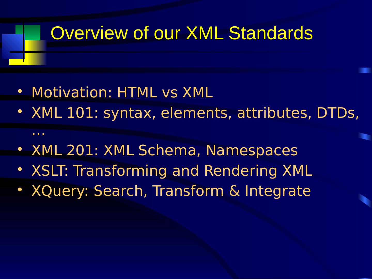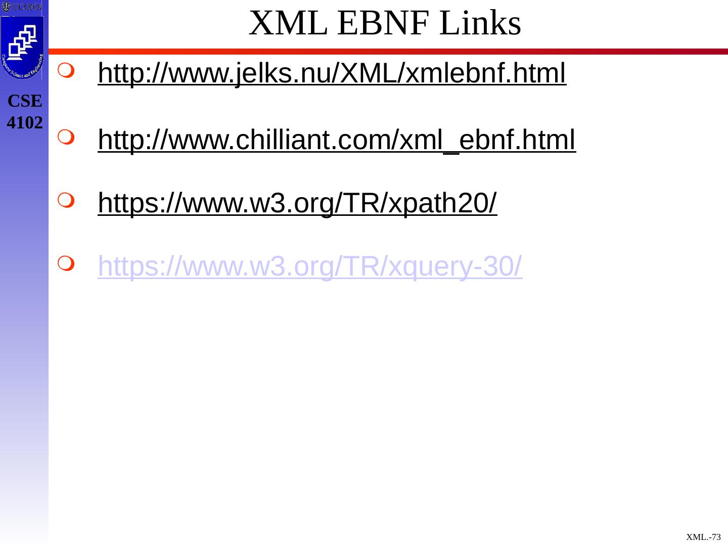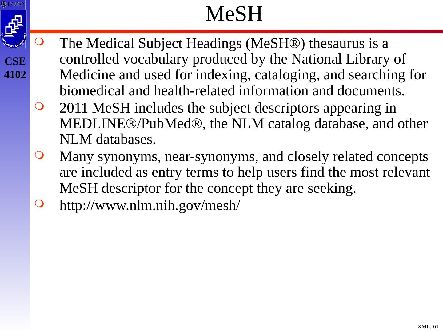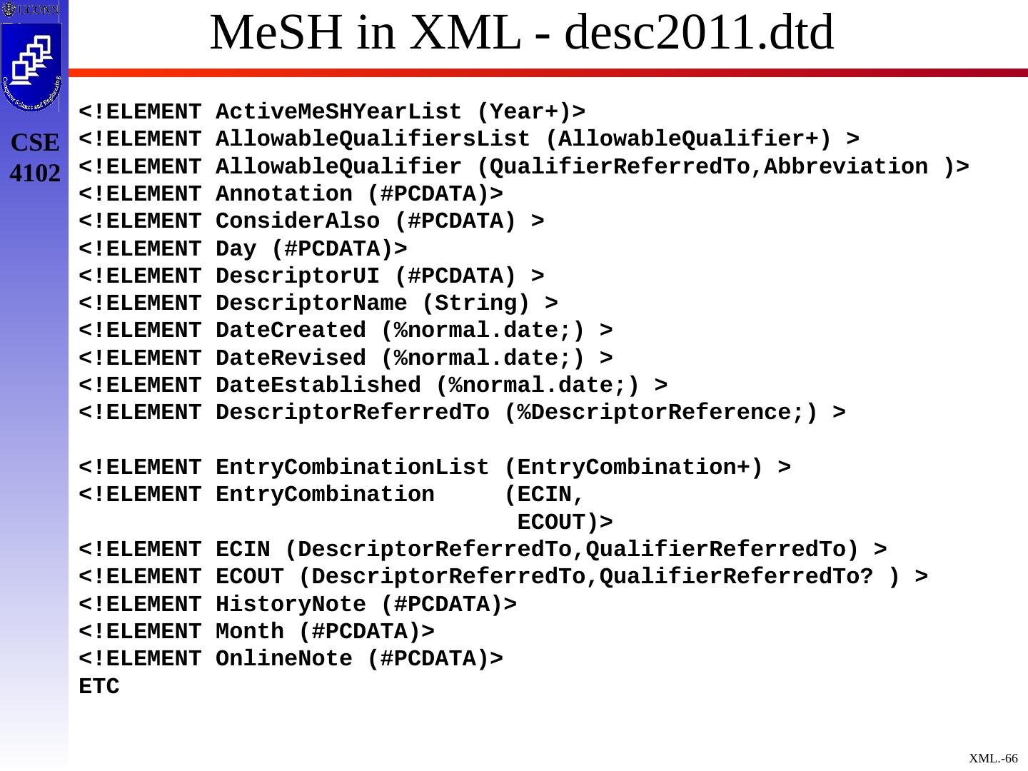 1 .XML Standards, Xpath , and XQuery What is XML? How is it Used Today? HL7 and CDA, CCR Biomedical InformaticsStandards MeSH ICD9 and ICD9-CM (Intl. Classification Diseases) ICD10 and ICD10-CM XML EBNF Supplemental Material on XPath and Xquery Web Server Programming CSE135 Winter 2004 db.ucsd.edu/static/CSE134A/XML-XQuery-XSLT.ppt Query Languages for XML http://infolab.stanford.edu/~ullman/fcdb/aut07/slides/xpath-xquery-xslt.ppt