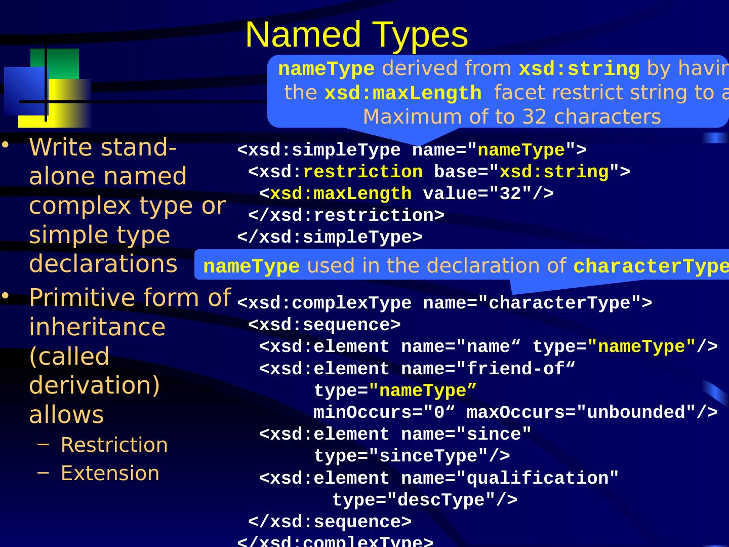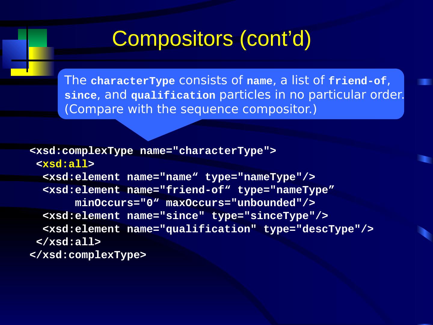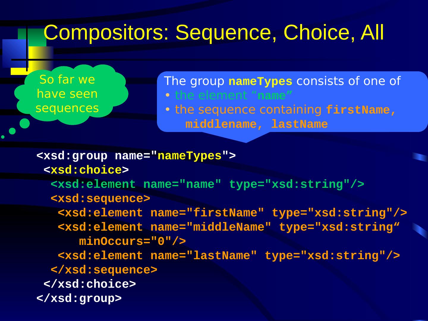 21 .XML Schema XML schema concepts: Description and XML namespace Annotations, documentation, language Elements and types First level element Element types, minOccurs, and maxOccurs Keys Structures of complex elements Composite attributes