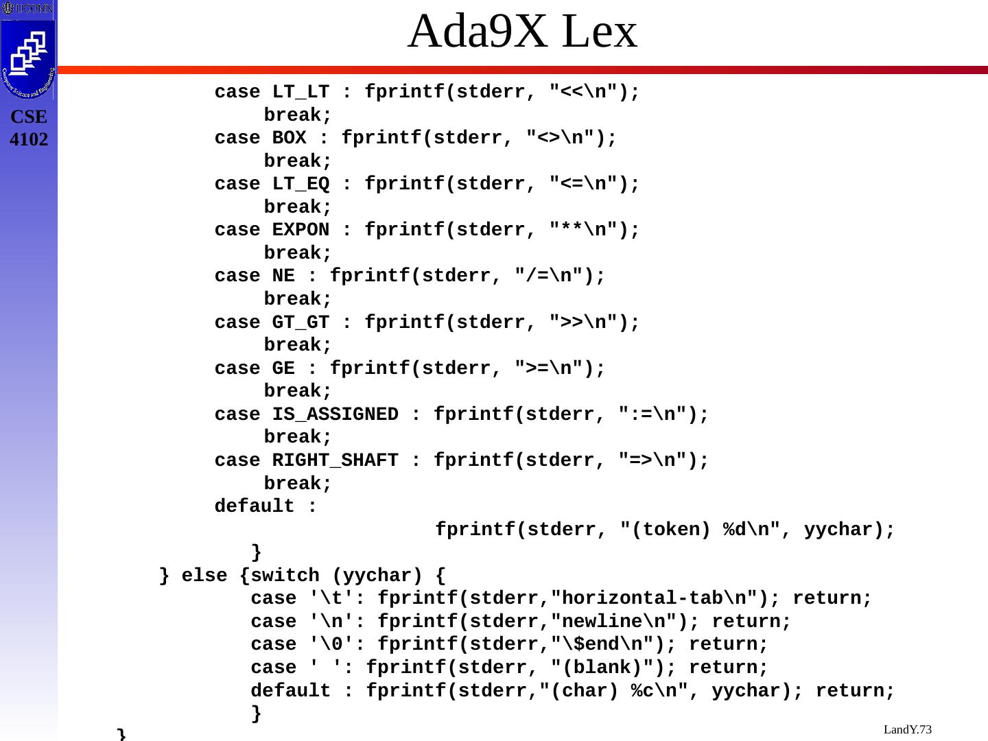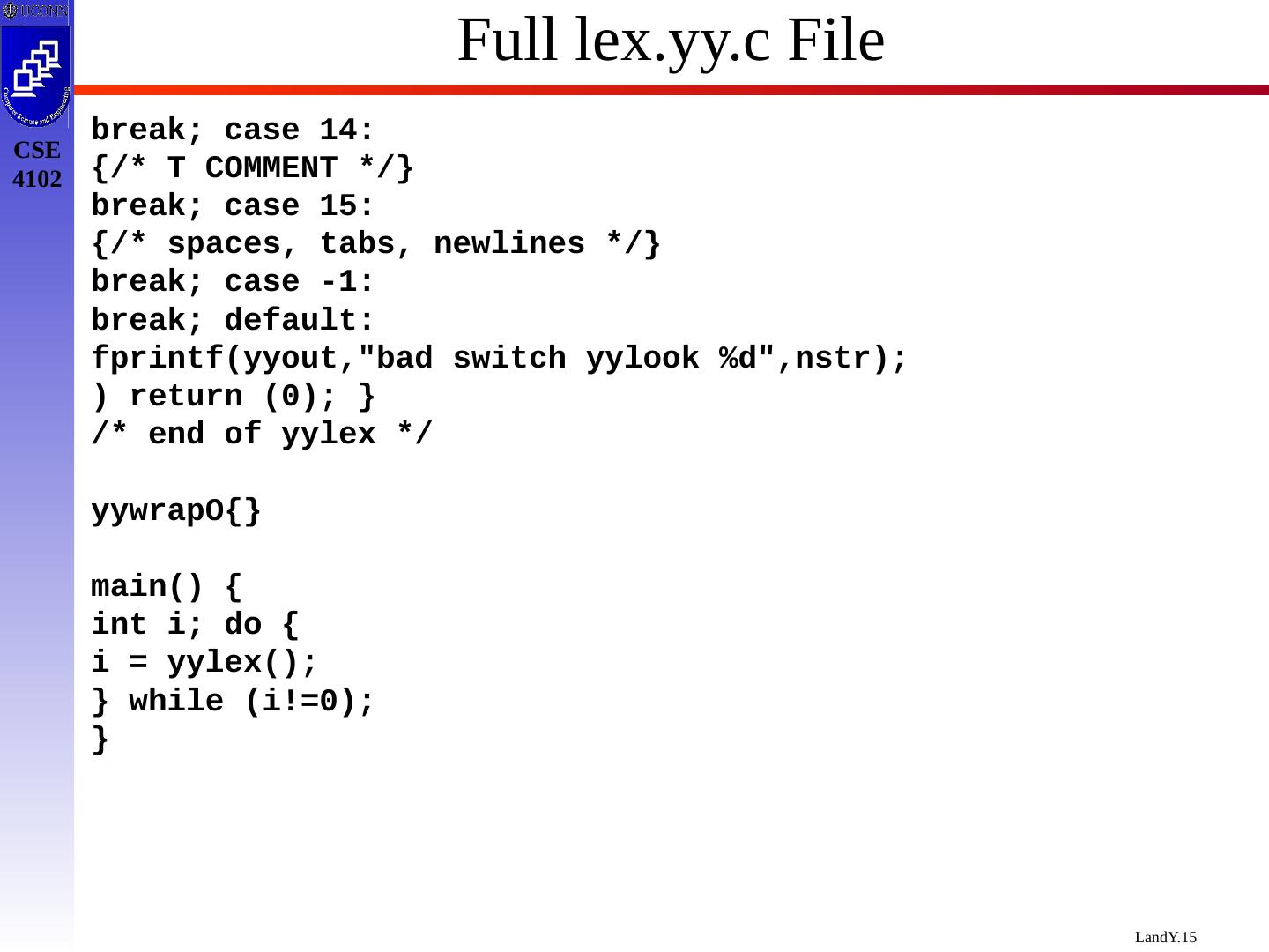 14 .Full lex.yy.c File case 4: { #ifdef PRNTFLG printf(" %s ", yytext); #endif return(T_THEN); } break; case 5: {printf(" %s ", yytext);return(T_EQ);} break; case 6: {printf(" %s ", yytext);return(T_LT);} break; case 7: {printf(" %s ", yytext);return(T_NE);) break; case 8: {printf(" %s ", yytext);return(T_GE);} break; case 9: {printf(" %s ", yytext);return(T_GT);} break; case 10: {printf(" %s ", yytext);return(T_IDENTIFIER);} break; case 11: {printf(" %s ", yytext);return(T_INTEGER);) break; case 12: {printf(" %s ", yytext) ;return(T_REAL); } break; case 13: {printf(" %s ", yytext);return(T_STRING);}