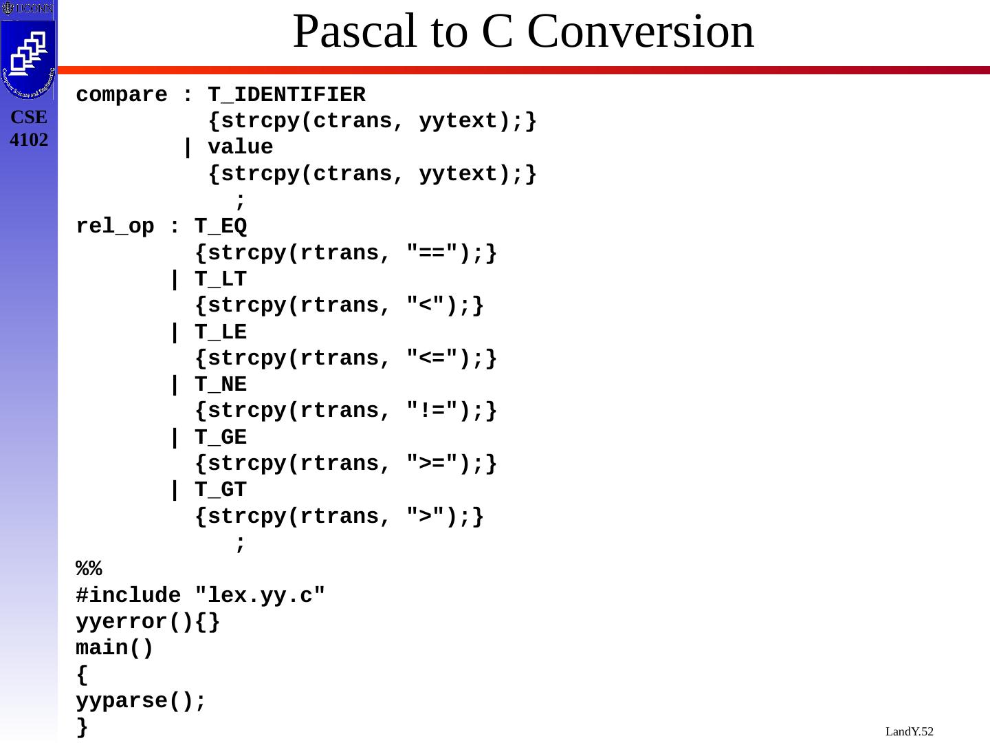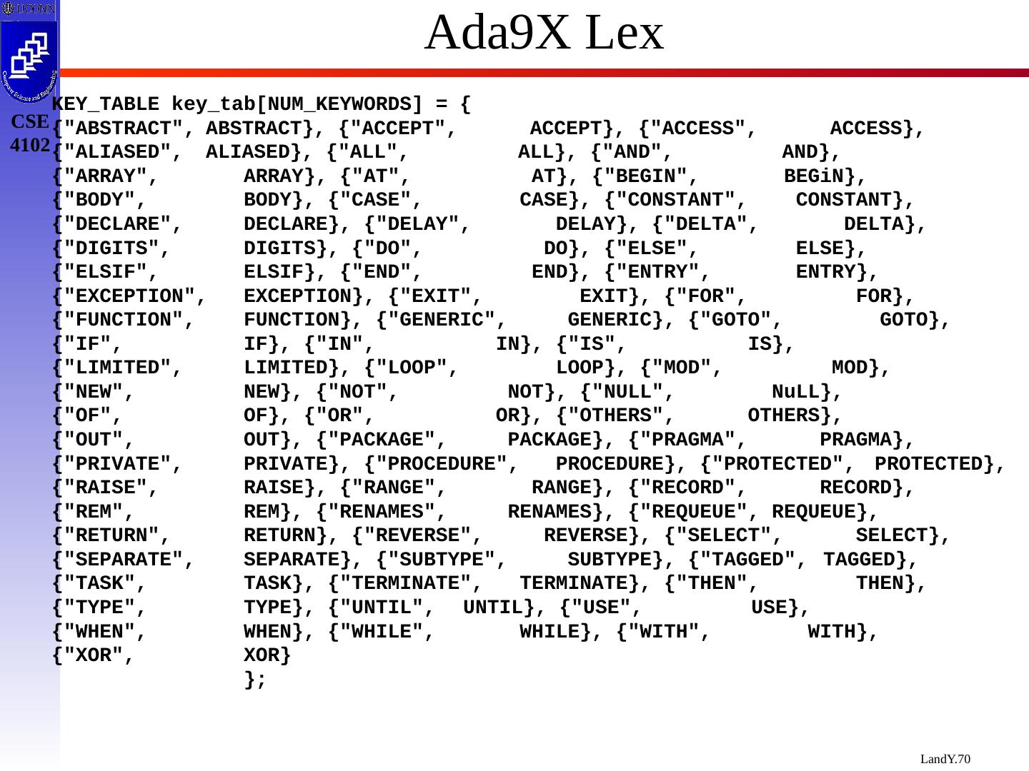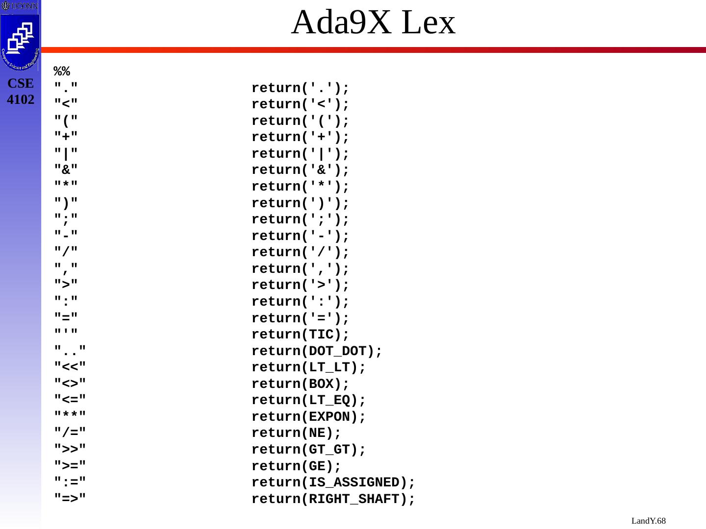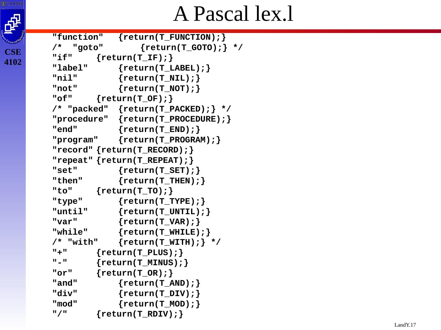 17 .A Pascal lex.l "function" {return(T_FUNCTION);} /* "goto" {return(T_GOTO);} */ "if" {return(T_IF);} "label" {return(T_LABEL);} "nil" {return(T_NIL);} "not" {return(T_NOT);} "of" {return(T_OF);} /* "packed" {return(T_PACKED);} */ "procedure" {return(T_PROCEDURE);} "end" {return(T_END);} "program" {return(T_PROGRAM);} "record" {return(T_RECORD);} "repeat" {return(T_REPEAT);} "set" {return(T_SET);} "then" {return(T_THEN);} "to" {return(T_TO);} "type" {return(T_TYPE);} "until" {return(T_UNTIL);} "var" {return(T_VAR);} "while" {return(T_WHILE);} /* "with" {return(T_WITH);} */ "+" {return(T_PLUS);} "-" {return(T_MINUS);} "or" {return(T_OR);} "and" {return(T_AND);} "div" {return(T_DIV);} "mod" {return(T_MOD);} "/" {return(T_RDIV);}