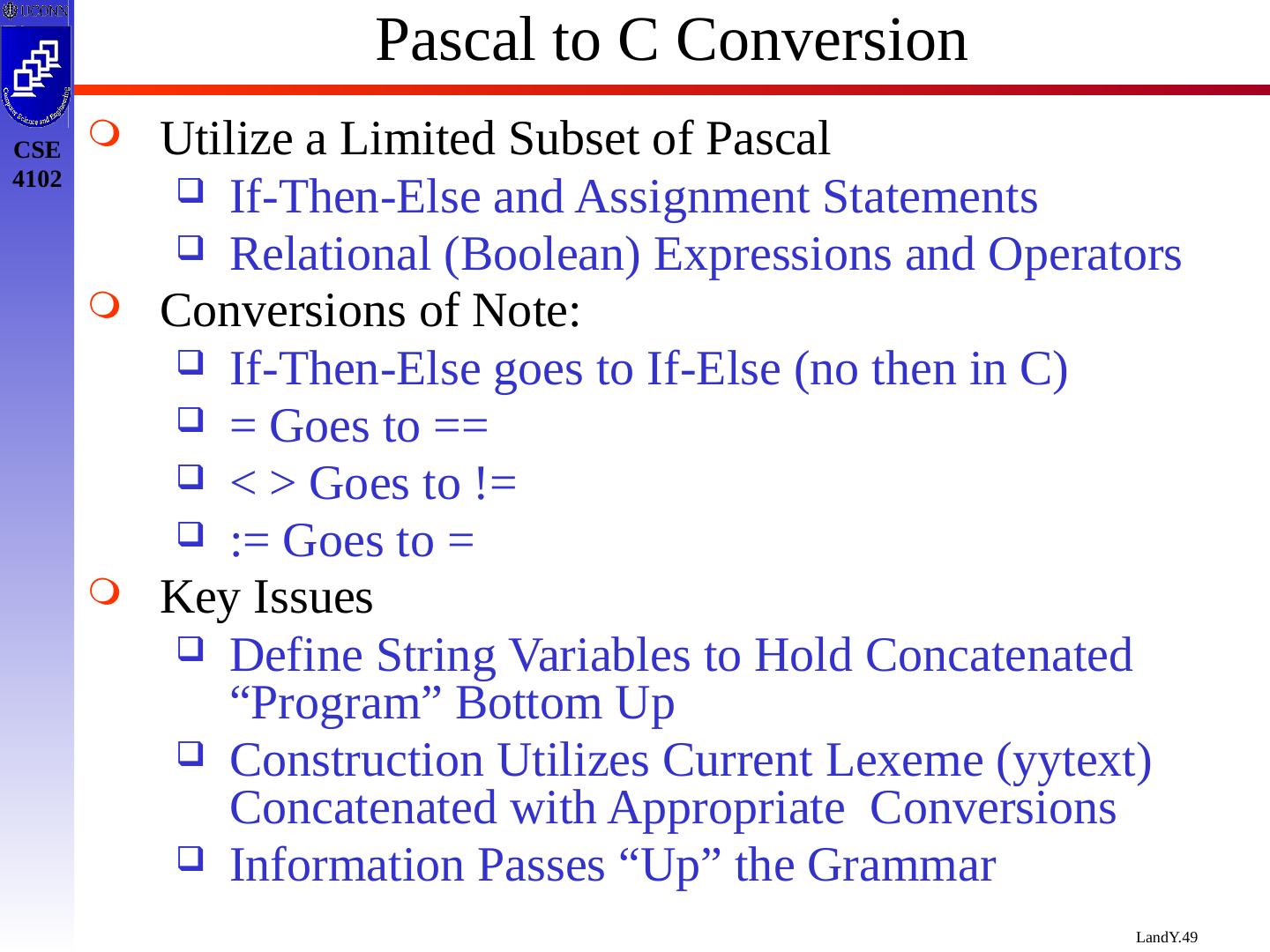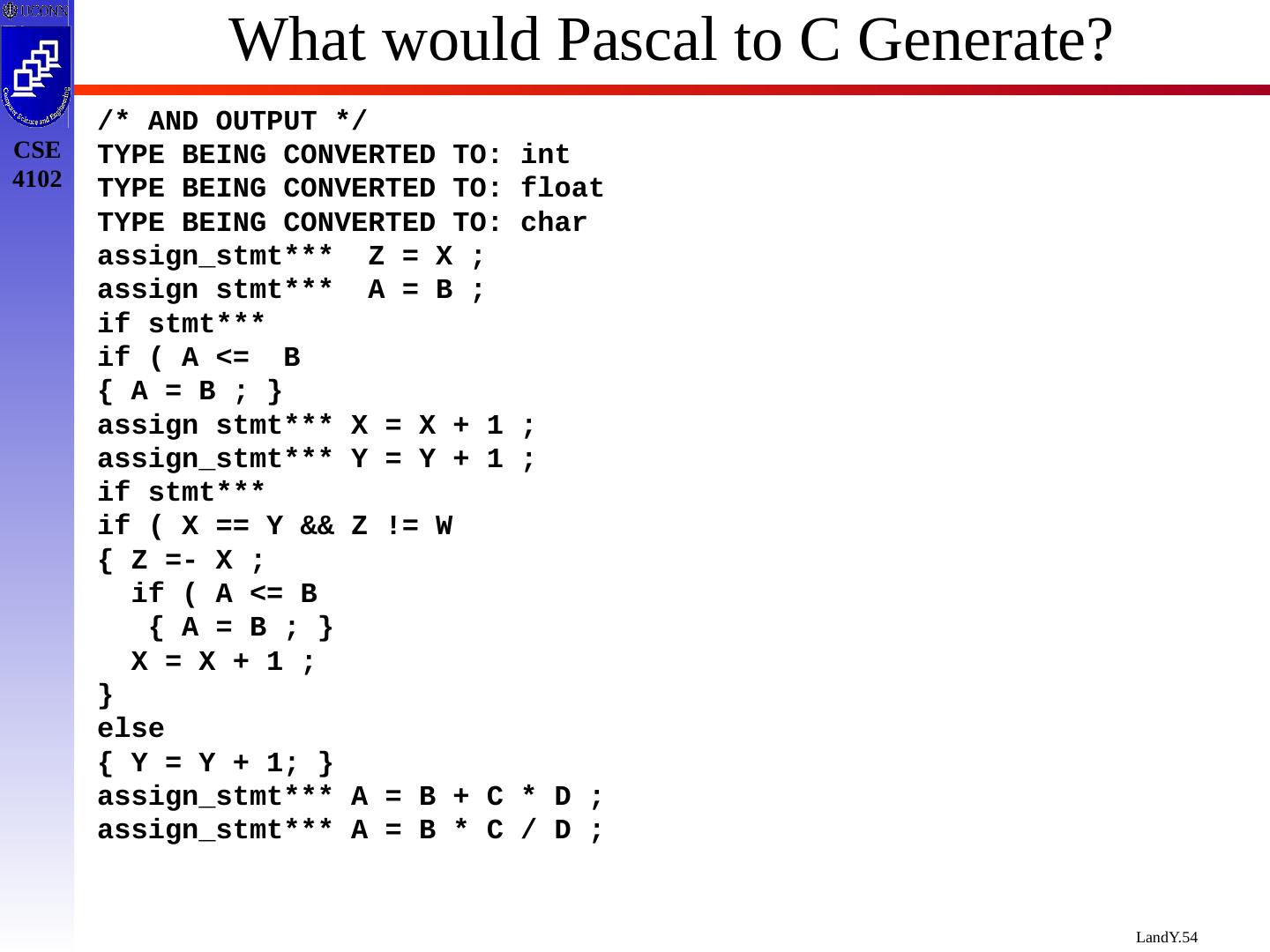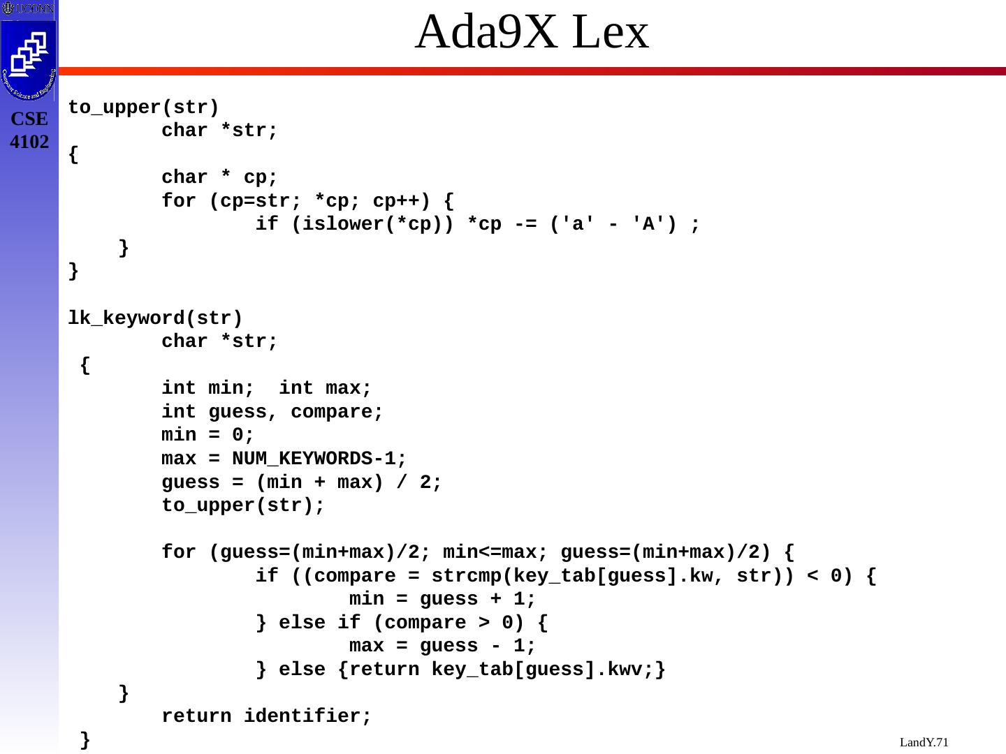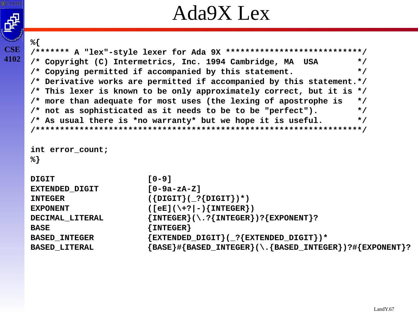 17 .A Pascal lex.l "function" {return(T_FUNCTION);} /* "goto" {return(T_GOTO);} */ "if" {return(T_IF);} "label" {return(T_LABEL);} "nil" {return(T_NIL);} "not" {return(T_NOT);} "of" {return(T_OF);} /* "packed" {return(T_PACKED);} */ "procedure" {return(T_PROCEDURE);} "end" {return(T_END);} "program" {return(T_PROGRAM);} "record" {return(T_RECORD);} "repeat" {return(T_REPEAT);} "set" {return(T_SET);} "then" {return(T_THEN);} "to" {return(T_TO);} "type" {return(T_TYPE);} "until" {return(T_UNTIL);} "var" {return(T_VAR);} "while" {return(T_WHILE);} /* "with" {return(T_WITH);} */ "+" {return(T_PLUS);} "-" {return(T_MINUS);} "or" {return(T_OR);} "and" {return(T_AND);} "div" {return(T_DIV);} "mod" {return(T_MOD);} "/" {return(T_RDIV);}