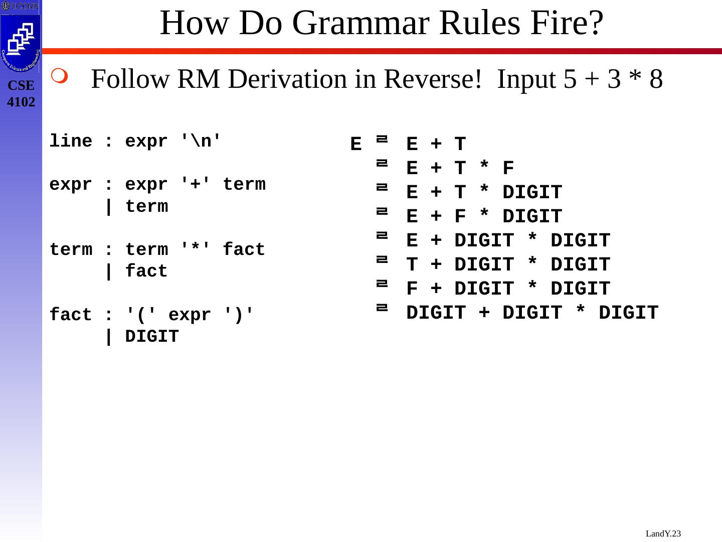 25 .Stack Performs RM Derivation in Reverse DIGIT E E + T E + T * F E + T * DIGIT E + F * DIGIT E + DIGIT * DIGIT T + DIGIT * DIGIT F + DIGIT * DIGIT DIGIT + DIGIT * DIGIT F T E + E DIGIT + E F + E T + E * T + E DIGIT * T + E F * T + E T + E E