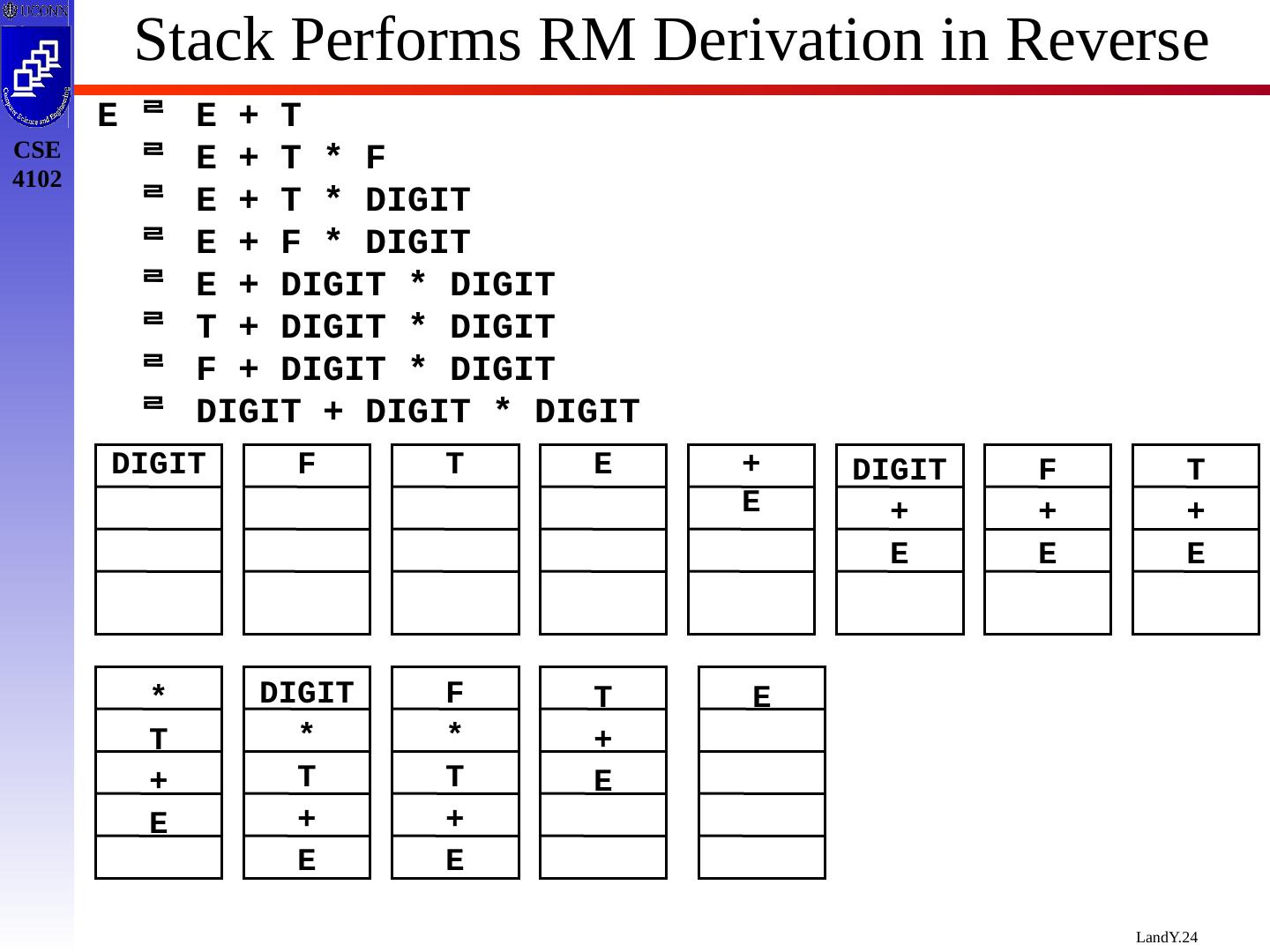 24 .Stack Performs RM Derivation in Reverse DIGIT E E + T E + T * F E + T * DIGIT E + F * DIGIT E + DIGIT * DIGIT T + DIGIT * DIGIT F + DIGIT * DIGIT DIGIT + DIGIT * DIGIT F T E + E DIGIT + E F + E T + E * T + E DIGIT * T + E F * T + E T + E E