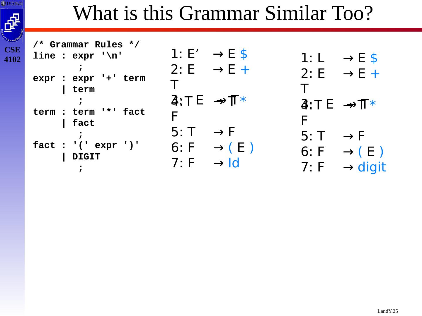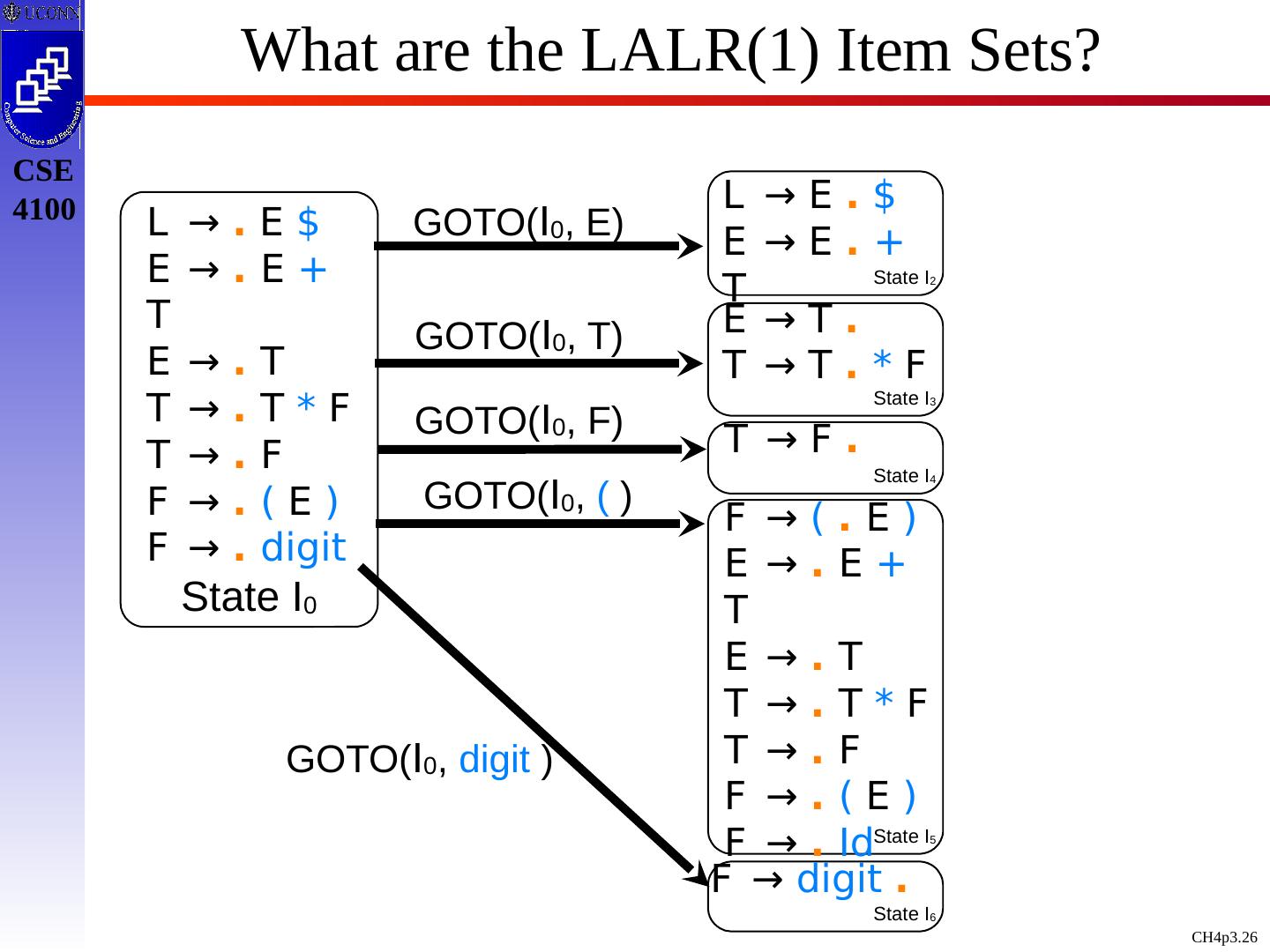 26 .What are the LALR(1) Item Sets? State I 6 GOTO( I 0 , digit ) F → digit . GOTO( I 0 , T) State I 3 E → T . T → T . * F State I 0 L → . E $ E → . E + T E → . T T → . T * F T → . F F → . ( E ) F → . digit GOTO( I 0 , E) State I 2 L → E . $ E → E . + T GOTO( I 0 , F) State I 4 T → F . State I 5 GOTO( I 0 , ( ) F → ( . E ) E → . E + T E → . T T → . T * F T → . F F → . ( E ) F → . Id