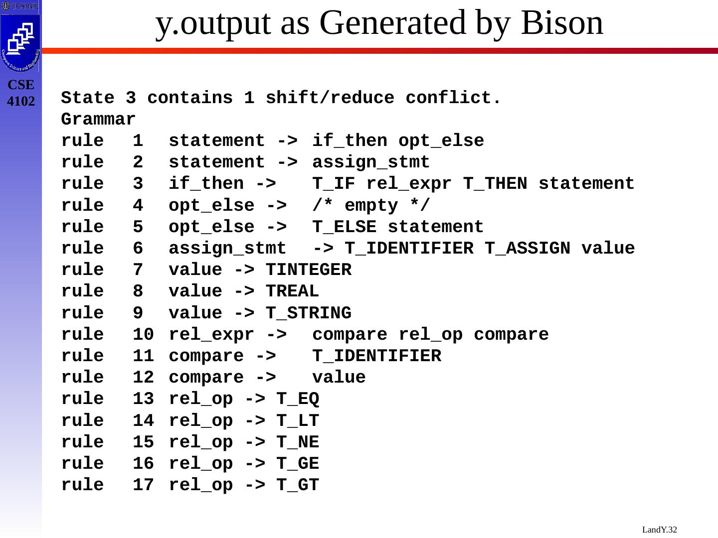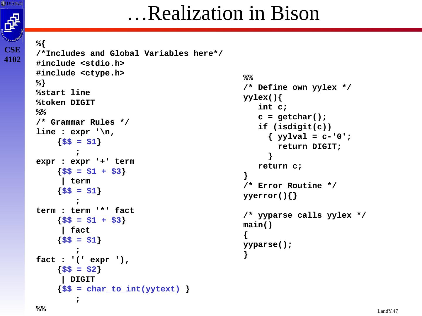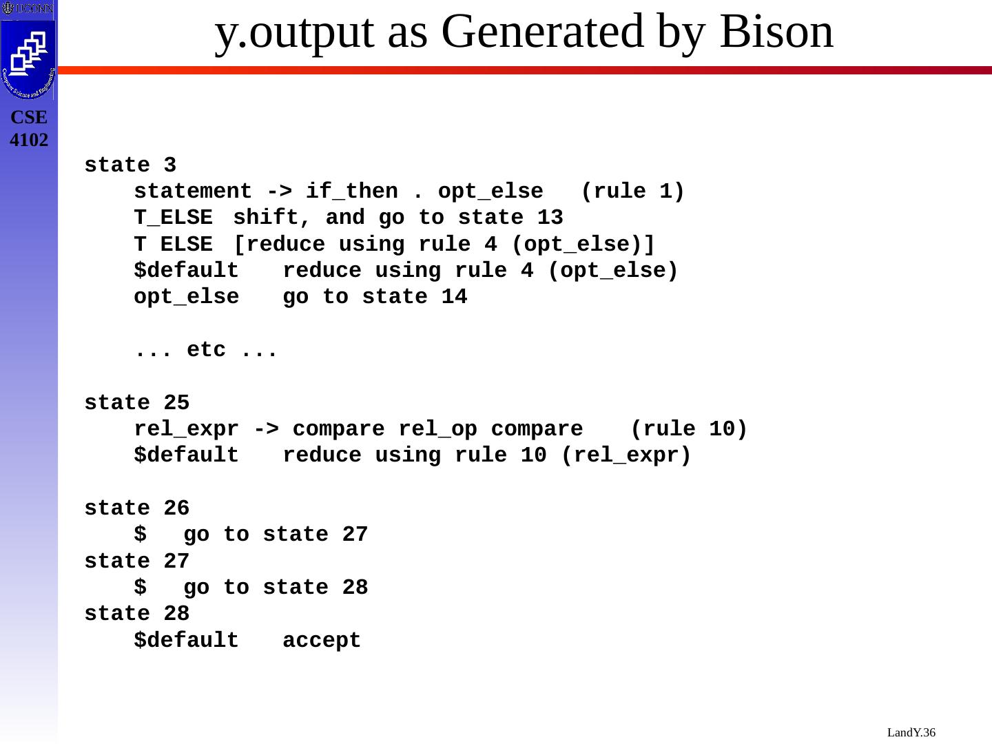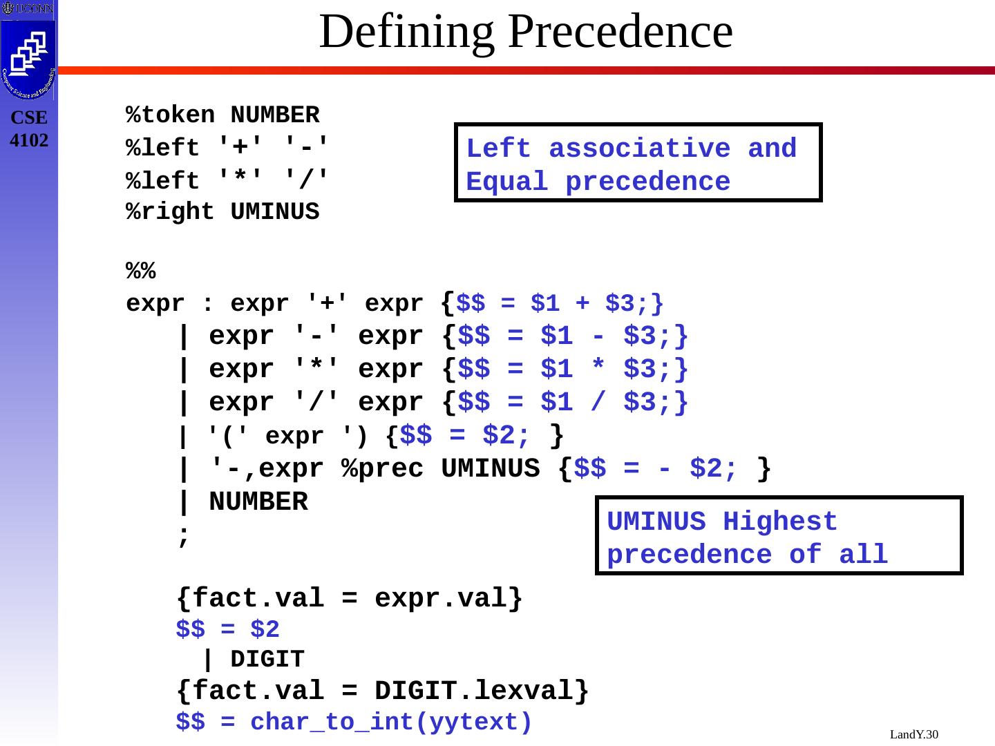 27 .LALR State Machine ( yacc –v *.y) Generates y.output state 0 $accept : _line $end DIGIT shift 6 ( shift 5 . error line goto 1 expr goto 2 term goto 3 fact goto 4 state 1 $accept line_$end $end accept . error state 2 line : expr_ (1) expr : expr_+ term + shift 7 • reduce 1 state 3 expr : term_ (3) term : term_* fact * shift 8 . reduce 3 state 4 term : fact_ (5) . reduce 5 state 5 fact : (_expr ) DIGIT shift 6 ( shift 5 . error expr goto 9 term goto 3 fact goto 4 state 6 fact : DIGIT (7) . reduce 7 state 7 expr : expr +_term DIGIT shift 6 ( shift 5 . error term goto 10 U fact goto 4 state 8 term : term *_fact DIGIT shift 6 ( shift 5 . error fact goto 11