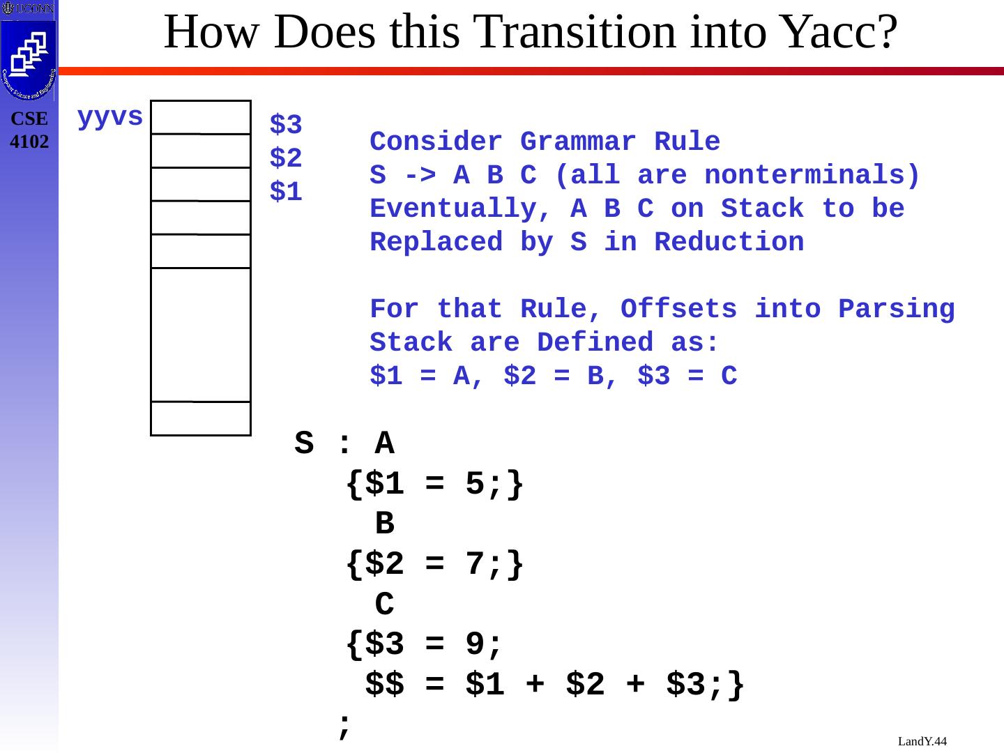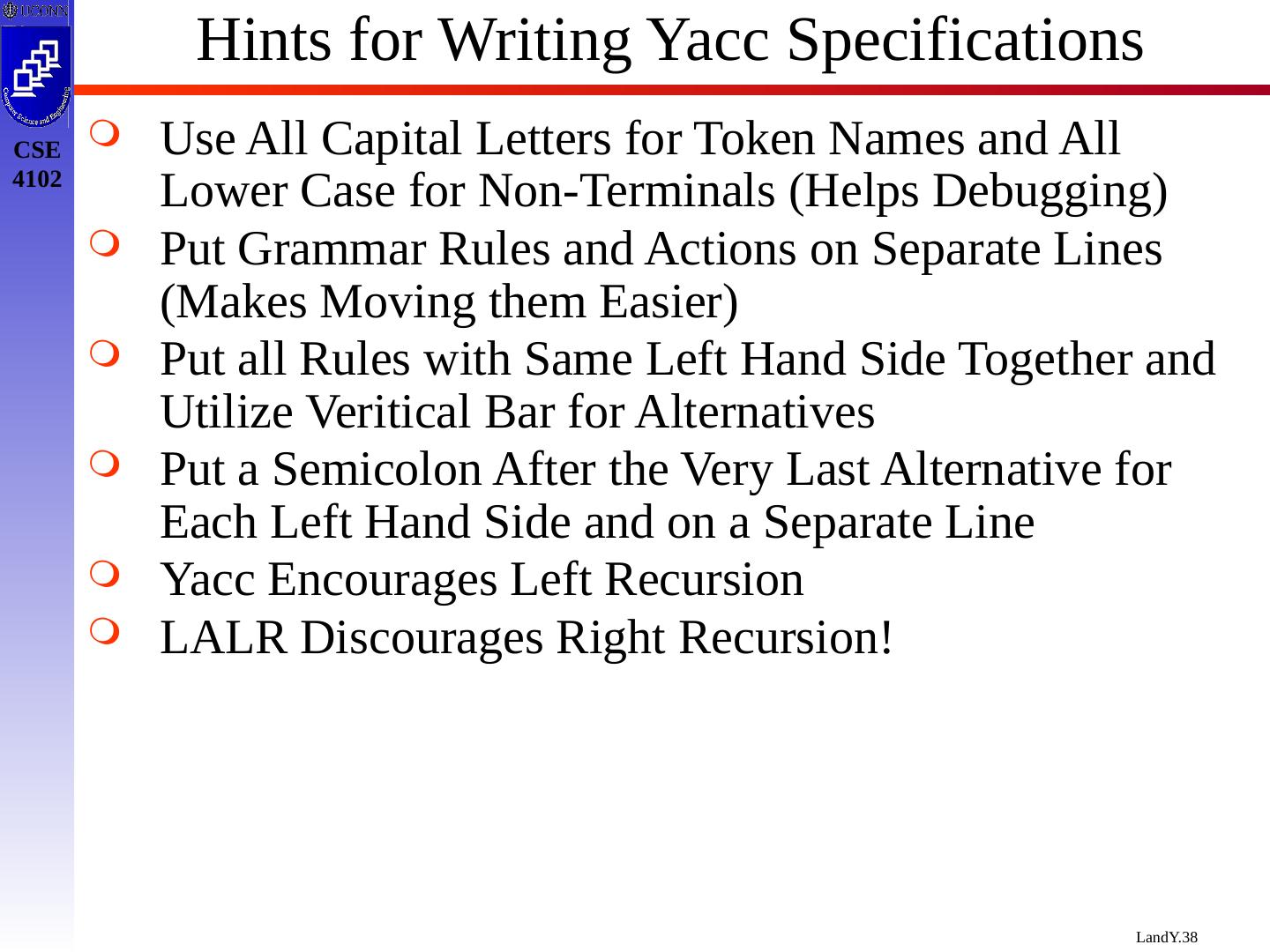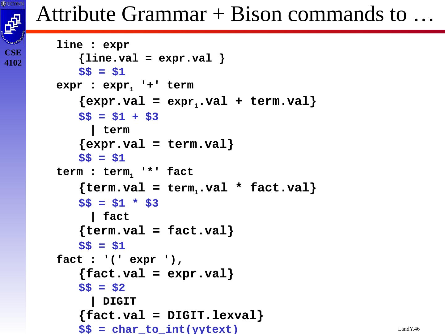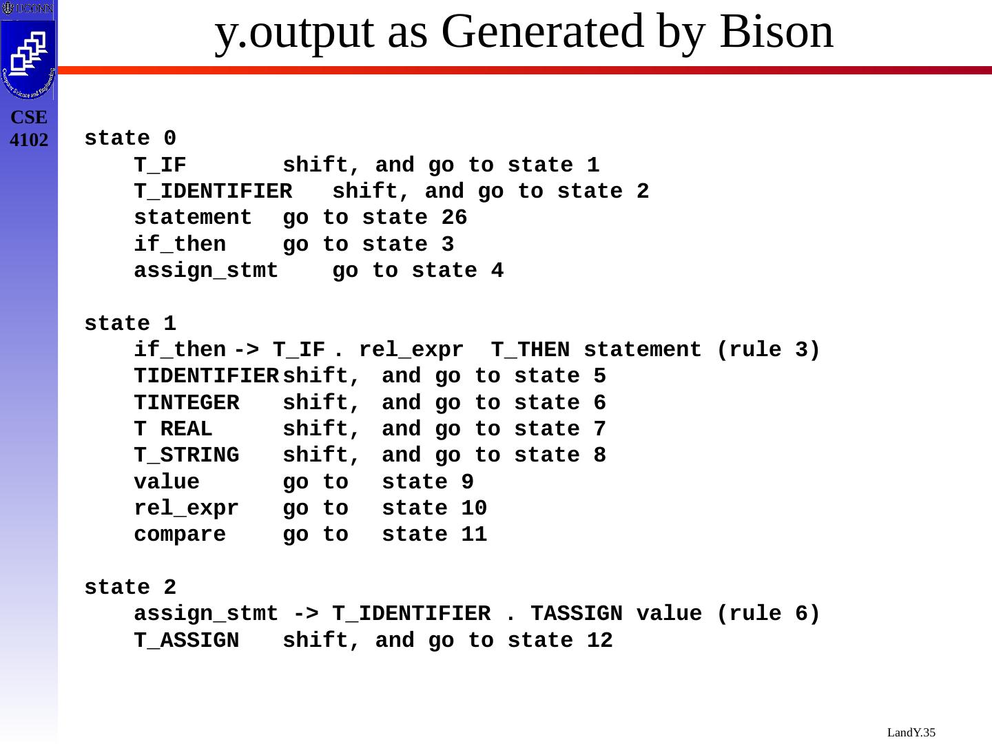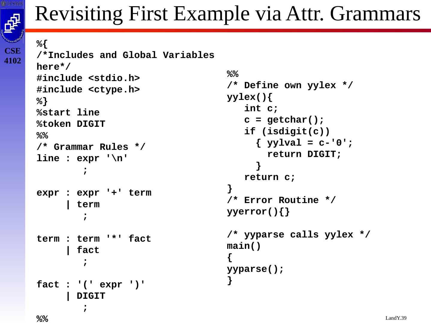 27 .LALR State Machine ( yacc –v *.y) Generates y.output state 0 $accept : _line $end DIGIT shift 6 ( shift 5 . error line goto 1 expr goto 2 term goto 3 fact goto 4 state 1 $accept line_$end $end accept . error state 2 line : expr_ (1) expr : expr_+ term + shift 7 • reduce 1 state 3 expr : term_ (3) term : term_* fact * shift 8 . reduce 3 state 4 term : fact_ (5) . reduce 5 state 5 fact : (_expr ) DIGIT shift 6 ( shift 5 . error expr goto 9 term goto 3 fact goto 4 state 6 fact : DIGIT (7) . reduce 7 state 7 expr : expr +_term DIGIT shift 6 ( shift 5 . error term goto 10 U fact goto 4 state 8 term : term *_fact DIGIT shift 6 ( shift 5 . error fact goto 11